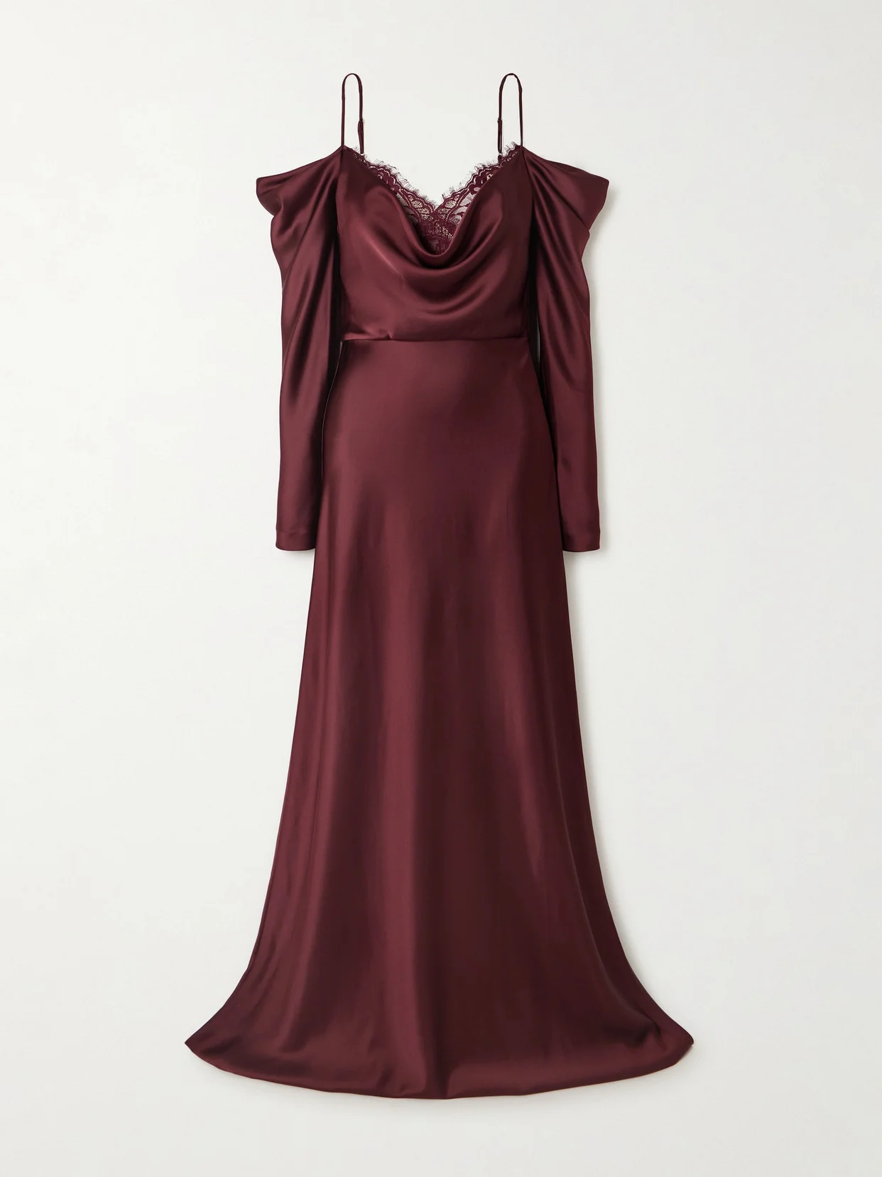Rebecca Vallance's 'Avalon' gown exudes a timeless elegance. Made from satin, it has delicate lace trims around the draped, off-the-shoulder neckline and falls from the fitted waist to a flowing, floor-pooling maxi skirt. Complement the rich burgundy tone with gold jewelry.