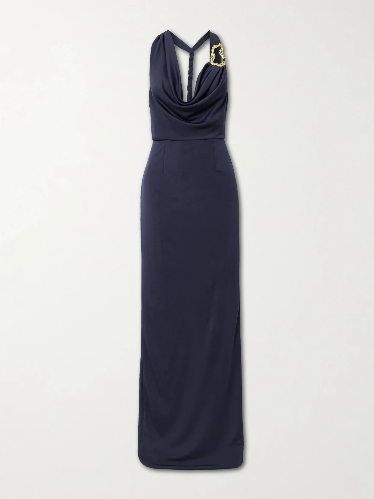 Rebecca Vallance's elegant dresses are always a stunning choice for important events. This 'Ayesha' gown is made from lustrous stretch satin-jersey that's artfully draped and embellished with a sculptural gold-tone ring. It falls to a glamorous floor-pooling hem, so wear yours with your highest heels.