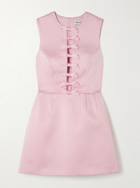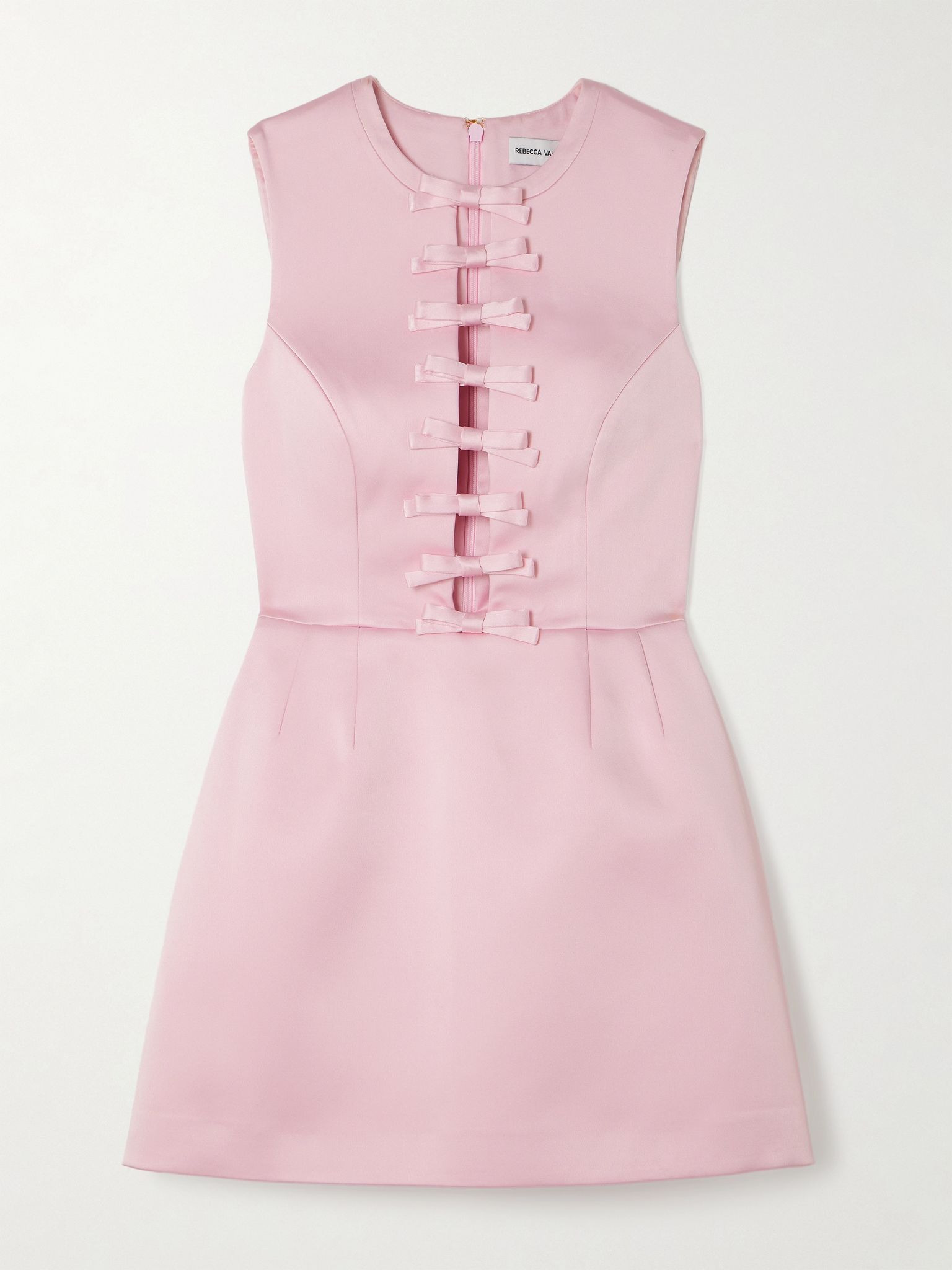 Rebecca Vallance's 'Aymee' dress offers the perfect balance of femininity and allure. Made from satin-twill in soft pink shade, it has a cutout bodice adorned with neat bows and flares out to a darted mini skirt. Create the illusion of longer legs with platform heels. Size & Fit - Fits true to size, take your normal size - Cut for a slim fit - Mid-weight, non-stretchy fabric - Model is 177cm/ 5'10" and is wearing a UK 8 Model measurements: - Bust: 85cm/ 33” - Waist: 66cm/ 26” - Hip: 92cm/ 36” Details & Care - Pink satin-twill - Concealed hook and zip fastening at back - 57% polyester, 43% acetate - Dry clean