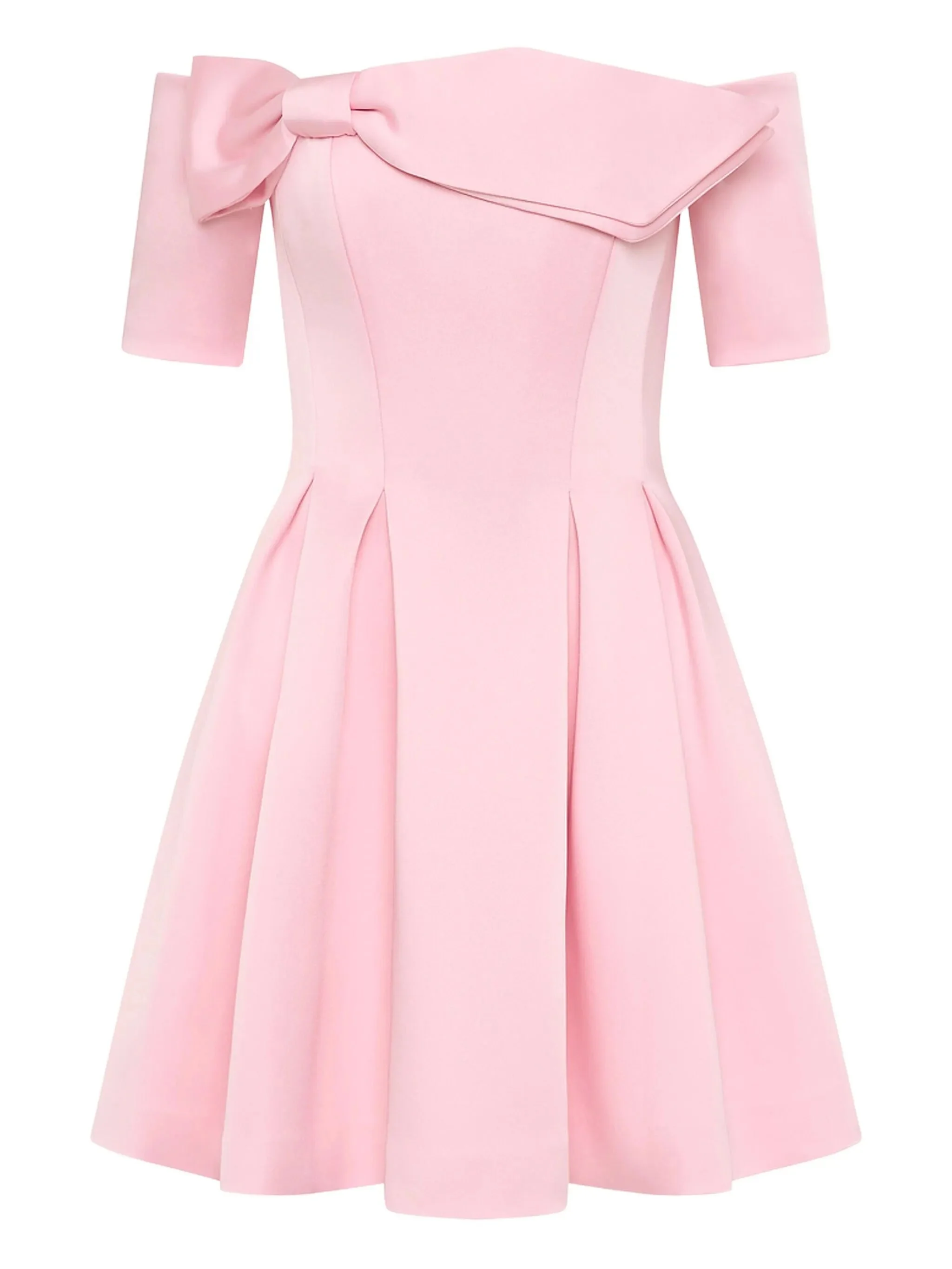 pale pink off-the-shoulder neckline short sleeves bow embellishment pleated skirt fitted bodice - Color: PINK - Made in: China - Designer Style ID: 2503-1180 SOPIN Composition and care Polyester: 57.0%, Acetate: 43.0%