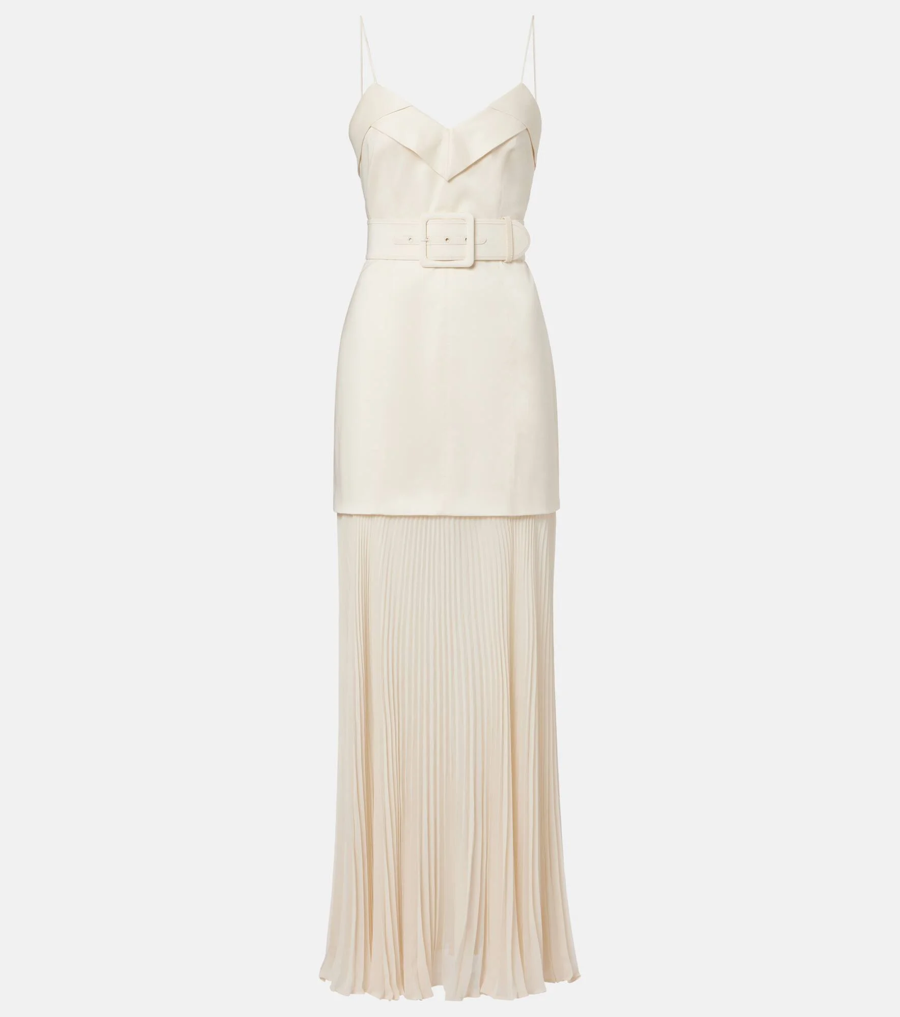 Crafted from stretch taffeta, the Bailey maxi dress from Rebecca Vallance exudes elegance with a flowing, sunray pleated skirt and structured bodice. The belted design features an origami neckline and Rouleau straps for a polished, architectural touch. Product Details - Material: 50% polyester, 45% nylon, 5% elastane - Care instructions: dry clean - Made in China - Designer color name: Cream - Item color: white - Material II: 100% polyester - Lining: 97% polyester, 3% elastane - Closure: zipped back - Collar: V-neck - Detachable belt - Half-lined - Item number: P01078208 Size & Fit - True to size - Cinched waist - Non-stretchy fabric - The model seen in the picture is 178cm-5'10" and wearing a size UK 6