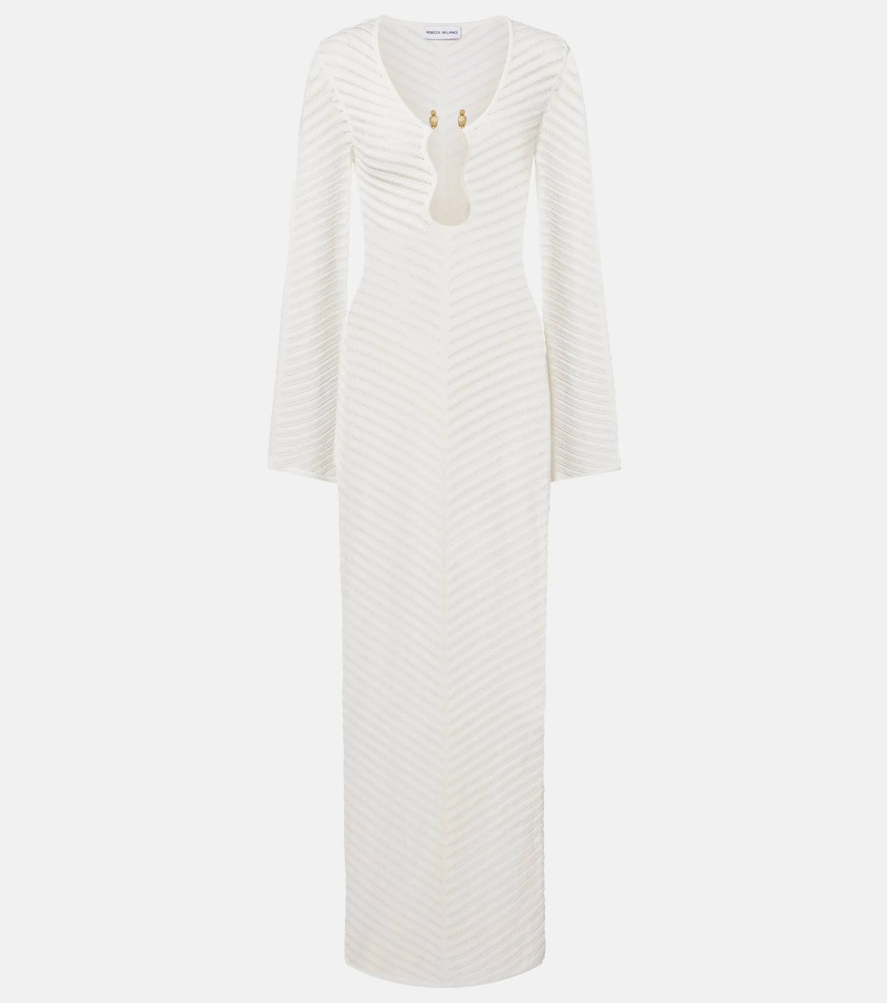 Every style from Rebecca Vallance is characterized by glitz and glamour. The Cassis maxi dress boasts a semi-sheer, knitted construction with a charming chevron pattern and a sculptural neckline. Product Details - Material: 63% viscose, 37% nylon - Care instructions: hand wash - Made in China - Color: white - Designer color name: Ivory - Hardware color: gold - Boning - Item number: P01129374 Size & Fit - True to size - Semi-sheer - Fitted - Stretchy fabric - The model seen in the picture is 178cm-5'10" and wearing a size XS