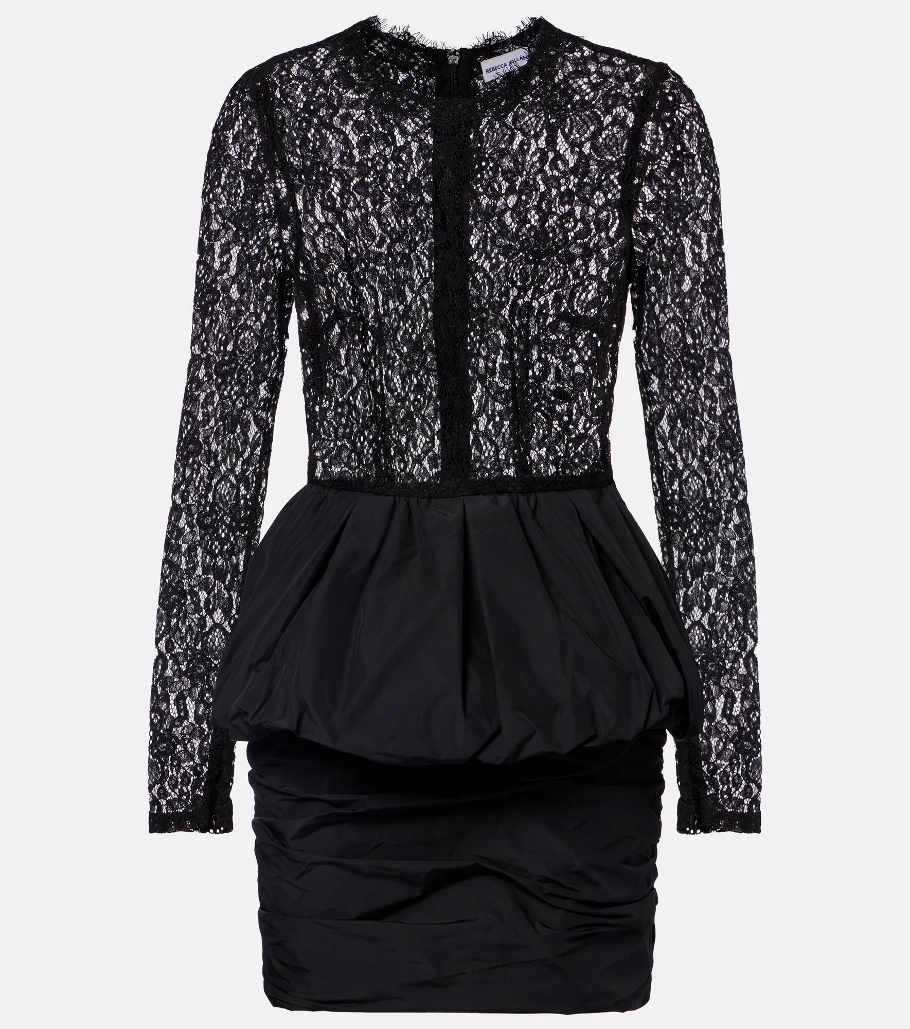 Every style from Rebecca Vallance is characterized by glitz and glamour. The Dixie minidress features a peplum taffeta skirt and a cotton-blend lace bodice adorned with a floral motif. Product Details - Material: 53% cotton, 37% nylon, 10% rayon - Care instructions: dry clean - Made in China - Color: black - Designer color name: Black - Item color: black - Lining: 97% polyester, 3% elastane - Lining II: 100% polyester - Details: 100% polyester - Closure: concealed zipped back - Item number: P01129380 Size & Fit - True to size - Close fit at the hips - Semi-sheer - Cinched waist - Non-stretchy fabric - The model seen in the picture is 178cm-5'10" and wearing a size UK 6