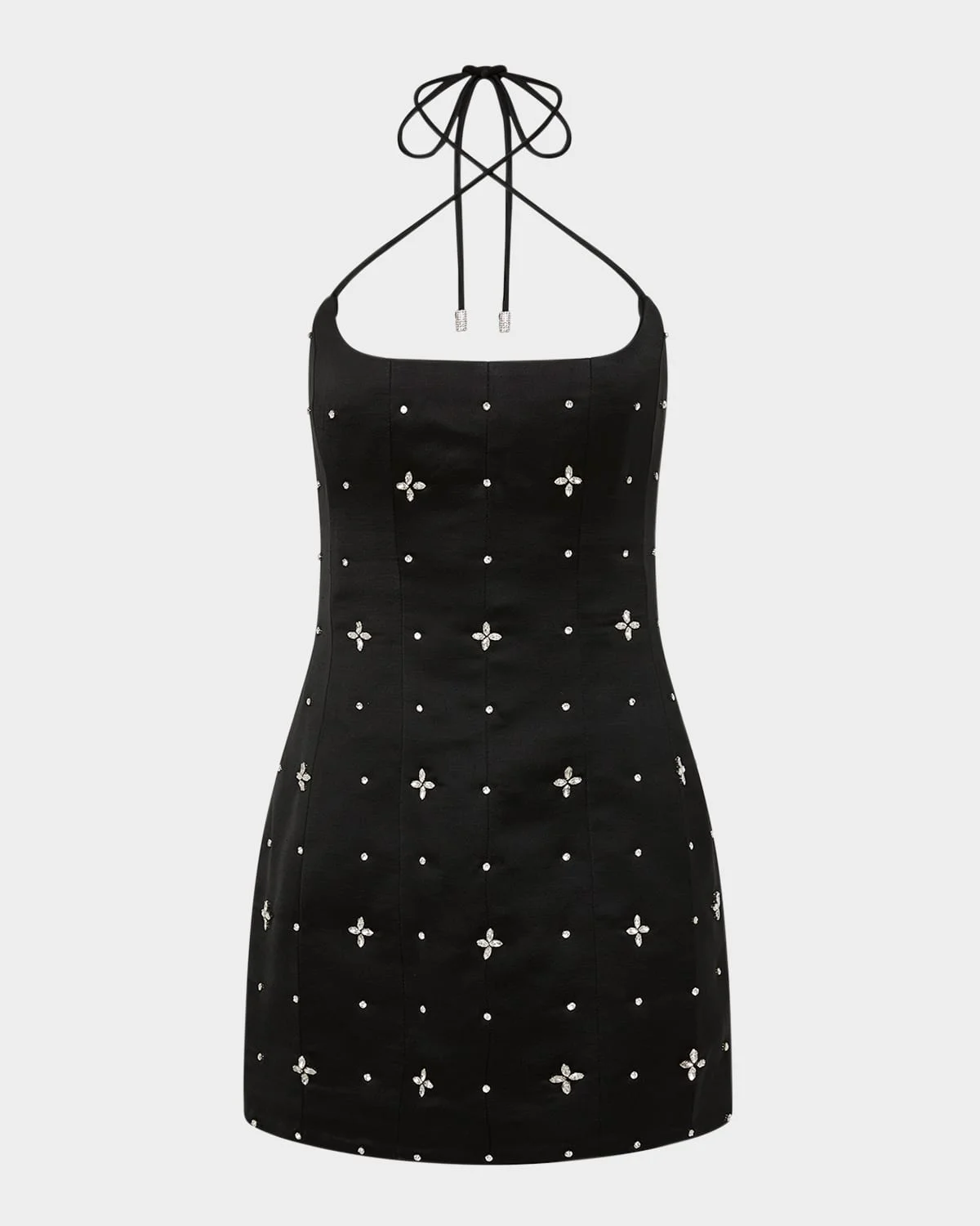 REBECCA VALLANCE "Eclipse" multiseamed mini dress with crystals Square neckline; selftie behind the neck Halter straps cross in the front Sleeveless Hem falls above the knee Aline silhouette Invisible back zipper Acetate/polyester Dry clean Imported