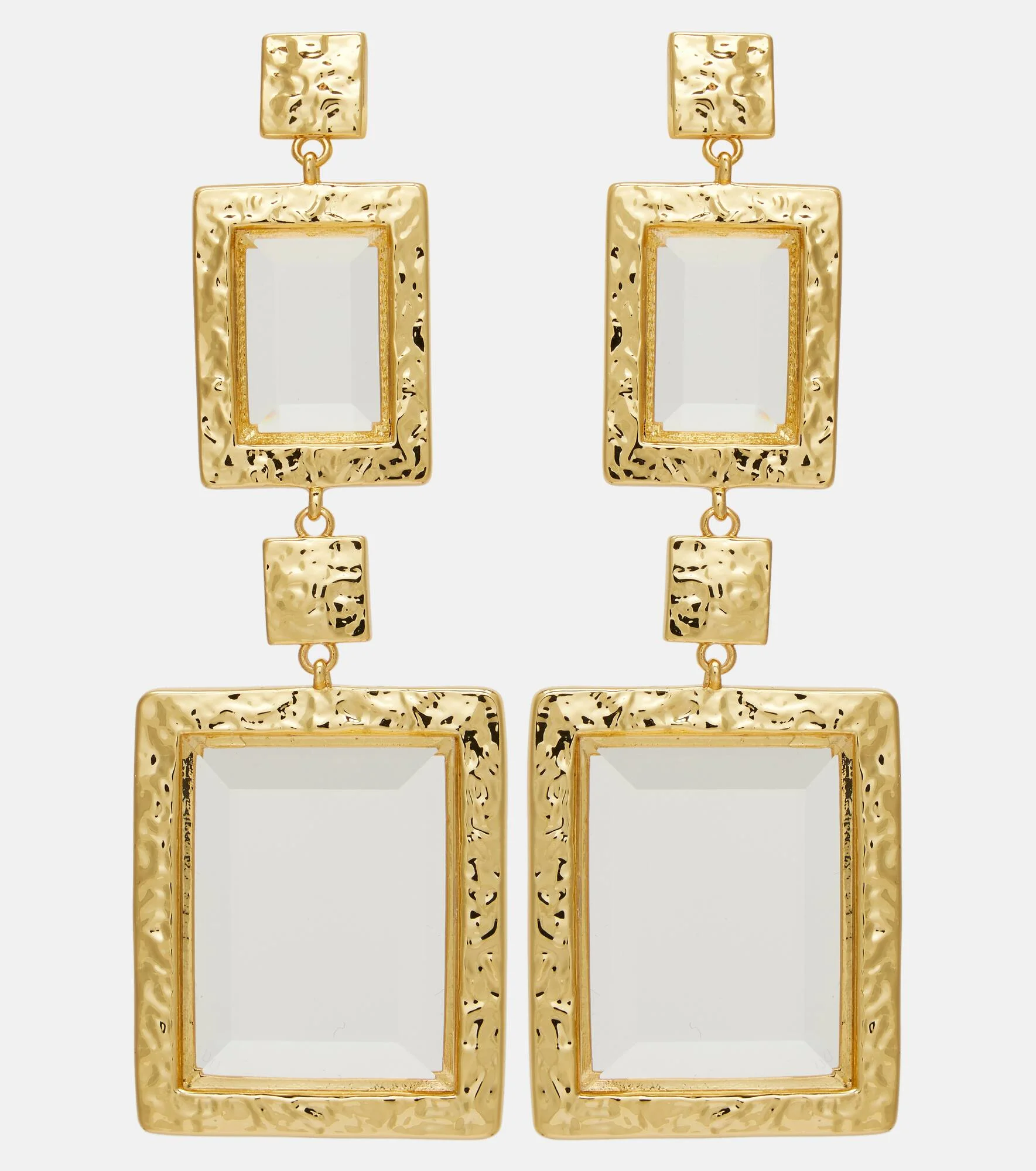 These gold-plated drop earrings from Rebecca Vallance are equally glamorous and elegant. The pair features butterfly-back fastening and is embellished with two tiers of central glass accents. Product Details - Material: 18kt gold-plated brass, glass - Made in China - Item color: gold - Closure: butterfly-back fastening - Includes: dust bag, box - Item number: P01106892 Size & Fit - Length 8cm-3" - Max. width 2,5cm-1"