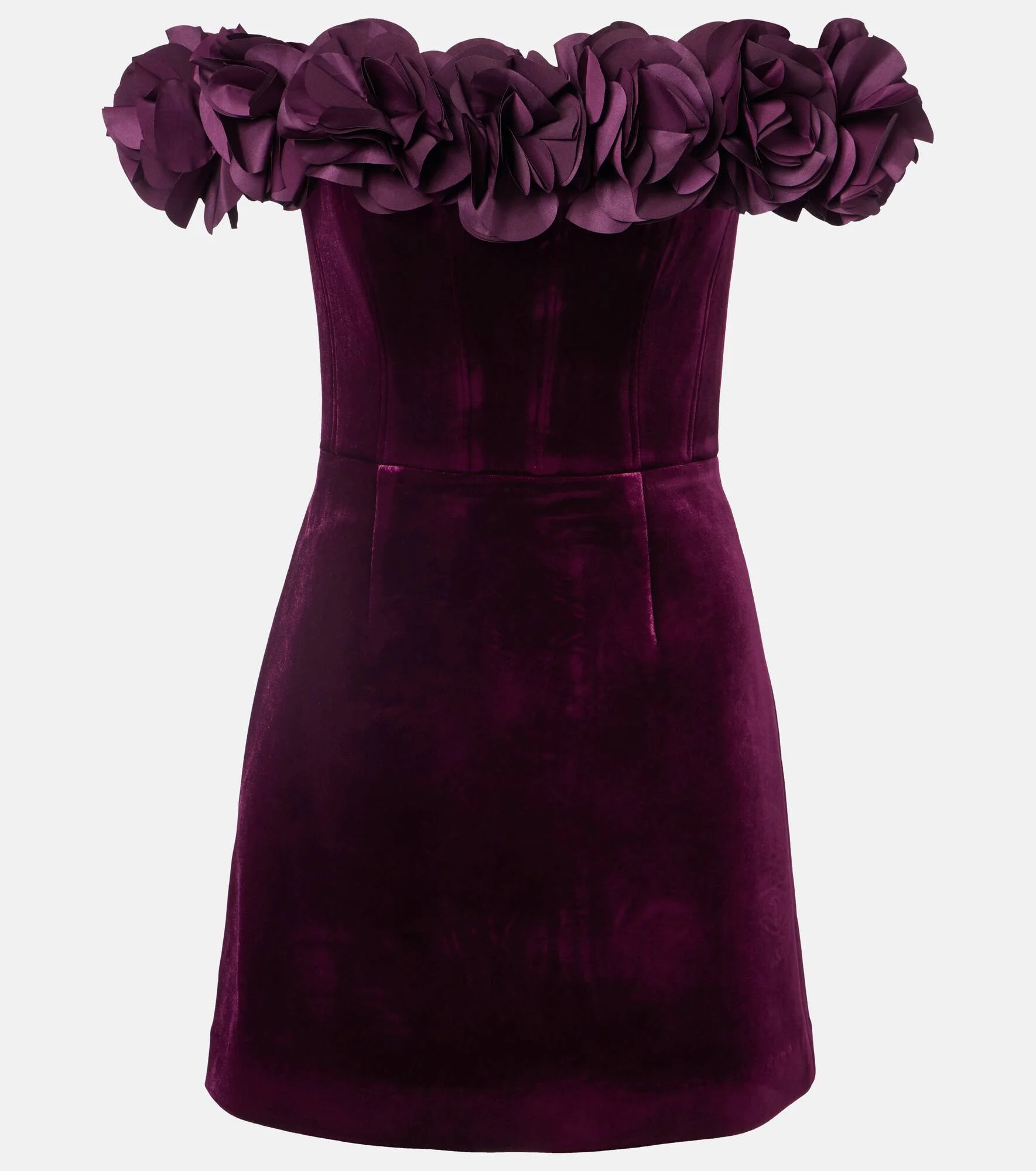 Established as the go-to brand for eye-catching occasionwear, every style from Rebecca Vallance is characterized by glitz and glamour. Crafted from velvet, this elegant minidress features an off-the-shoulder floral-applique neckline. Product Details - Material: 93% polyester, 7% elastane - Care instructions: dry clean - Made in China - Designer color name: Blackberry - Item color: purple - Lining: 97% polyester, 3% elastane - Material II: 100% polyester - Boning - Closure: concealed zipped back, hook-fastening back - Item number: P01118470 Size & Fit - True to size - Off-the-shoulder - Internal boned corset for support - Fitted - Non-stretchy fabric - The model seen in the picture is 178cm-5'10" and wearing a size UK 6