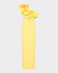 - REBECCA VALLANCE "Lulu" gown with pleated ruffle and rosette detail - One-shoulder neckline - Sleeveless - Center back slit - Full length - Column silhouette - Polyester/elastane - Dry clean - Imported