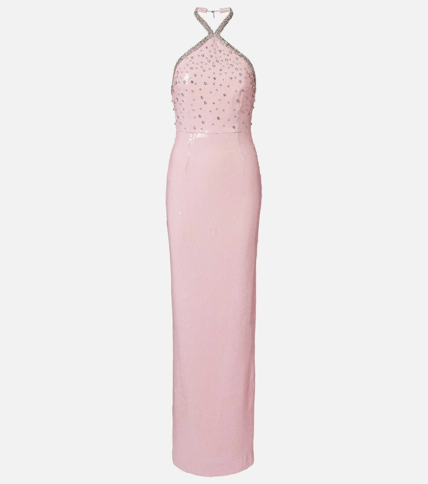 Every style from Rebecca Vallance is characterized by glitz and glamour. Shaped with a halter neckline, the Lydia column gown features all-over sparkling sequins and dazzling crystal embellishments. Product Details - Material: 90% polyester, 10% elastane - Care instructions: dry clean - Made in China - Designer color name: Light Pink - Item color: pink - Lining: 95% polyester, 5% elastane - Details: 100% polyethylene - Hardware color: silver - Closure: concealed zipped back - Long vent - Item number: P01129385 Size & Fit - True to size - Low back - Fitted - Non-stretchy fabric - The model seen in the picture is 178cm-5'10" and wearing a size UK 6