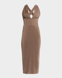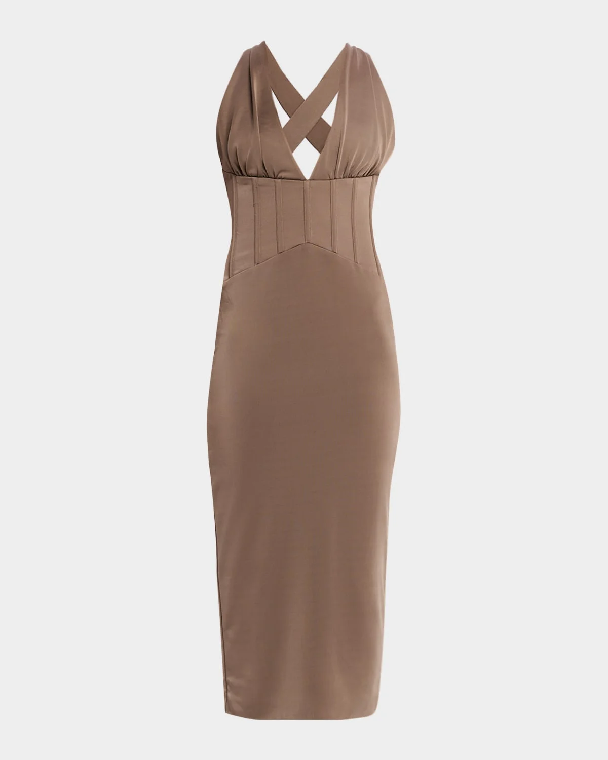This REBECCA VALLANCE "Mischa" midi dress is cut from soft bodyskimming fabric with a corseteffect waistband for added structure Approx. 49.5"L from shoulders to hem Deep V halter neckline Sleeveless Center back slit Hem falls below the knee Column silhouette Invisible back zipper Polyester/nylon/polyamide/elastane Lining: Polyester Dry clean Imported