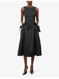 PRODUCT DETAILS - Rebecca Vallance taffeta midi dress - 100% polyester; lining 97% polyester, 3% elastane - Concealed zip fastening at back - Regular fit, boat neckline, dropped waist, sleeveless, bow embroideries at side, gathered waist, two side slip pockets, low scoop back, flared skirt, midi length fully lined - Specialist dry clean only - True to size - Size UK 8: length 47.5in / 121cm - Model is 5ft 10in/1.78m and wears a size UK 8 - Lightweight, non-stretch Ref: R04552319