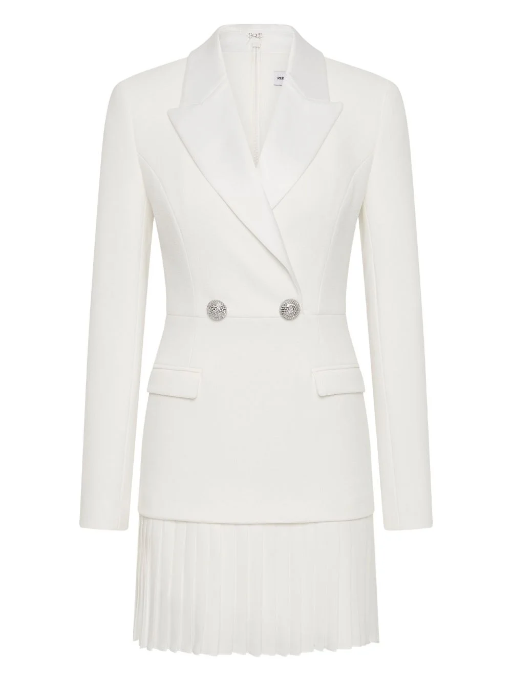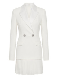 pleated double-breasted dress Highlights - Ivory - Pleated skirt - Double-breasted - Crystal buttons - Notched lapel - Long sleeves Imported Composition Polyester 98%, Elastane 2% Washing instructions Dry Clean Only