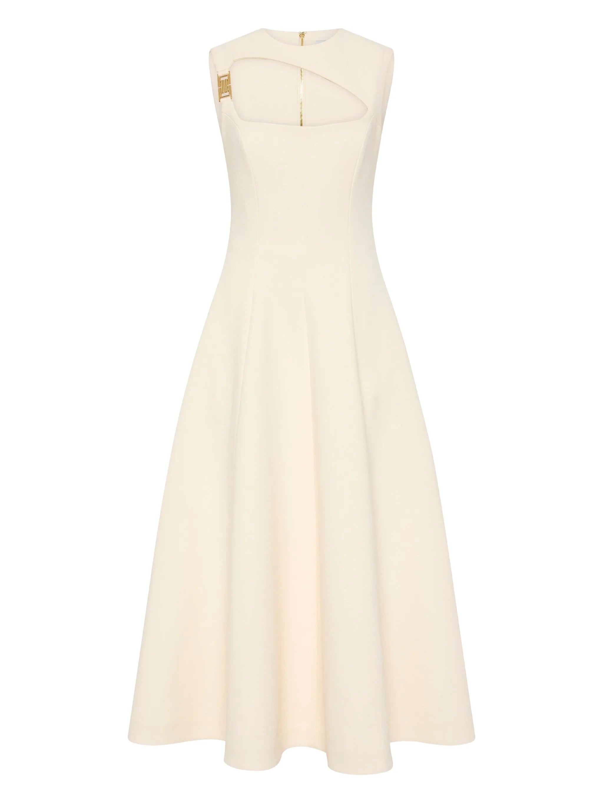 ivory sleeveless design unique cut-out at bodice gold-tone hardware accent A-line silhouette flared skirt - Color: WHITE - Made in: China - Designer Style ID: 2502-1100 CREAM Composition and care Polyester: 98.0%, Elastane: 2.0%