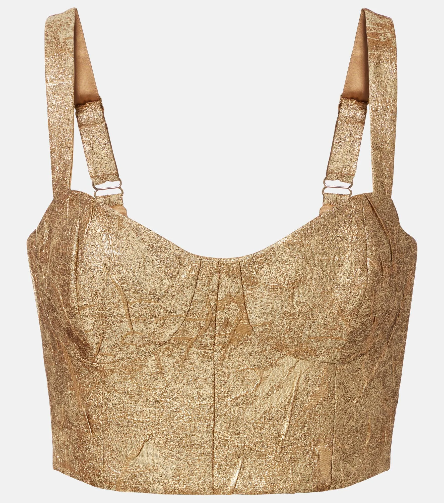 Established as the go-to brand for eye-catching occasionwear, every style from Rebecca Vallance is characterized by glitz and glamour. The Solana bustier top features adjustable shoulder straps for a perfect fit and a sleek, statement-making silhouette. Product Details - Material: 54% polyester, 28% metallic fibres, 18% nylon - Care instructions: dry clean - Made in China - Designer color name: Gold - Item color: gold - Hardware color: gold - Lining: 95% polyester, 5% elastane - Adjustable shoulder straps - Closure: zipped back - Boning - Item number: P01111828 Size & Fit - True to size - Internal boned corset for support - Fitted - Non-stretchy fabric - Cropped - The model seen in the picture is 178cm-5'10" and wearing a size UK 6