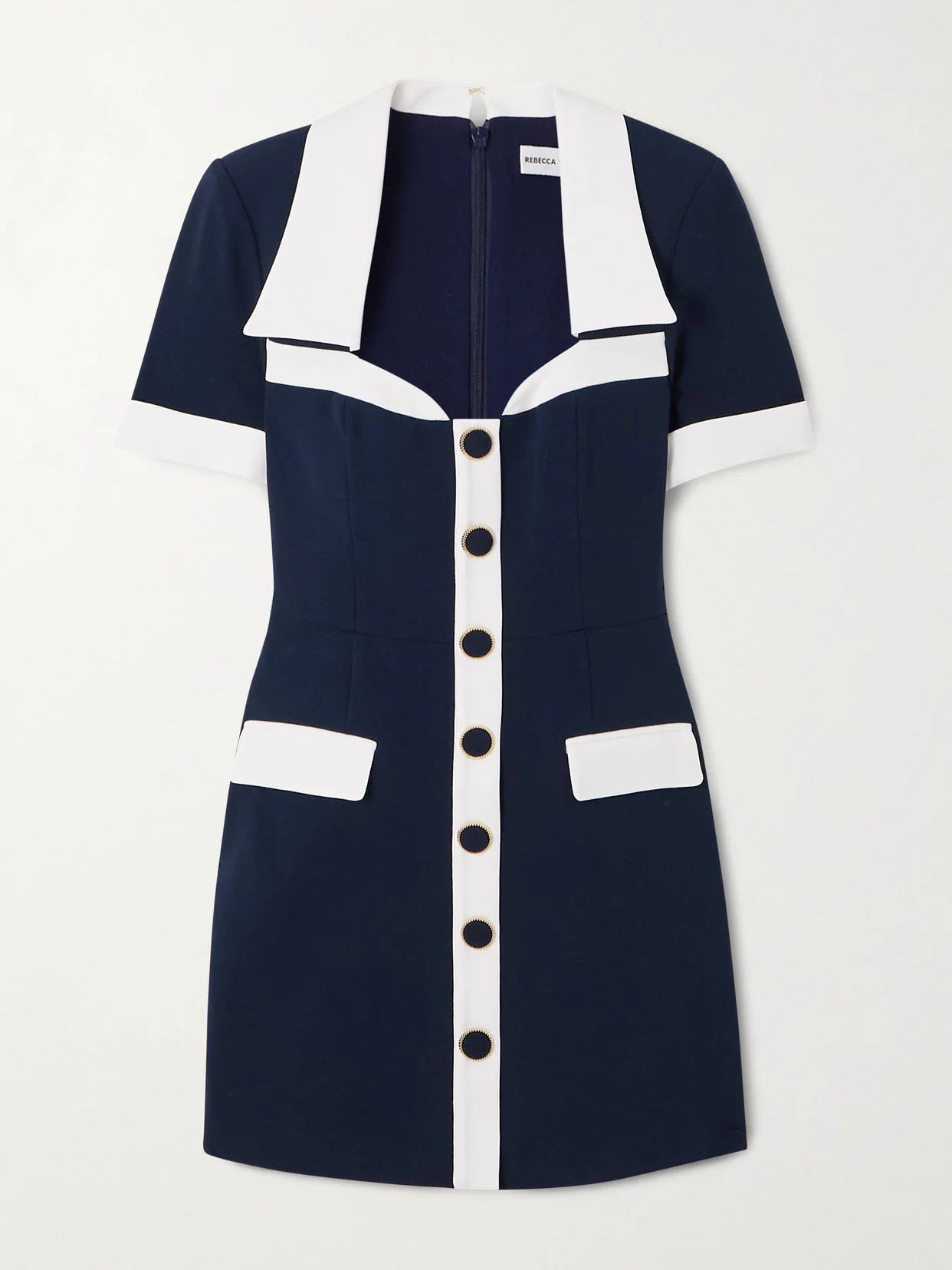 There's a chic, retro charm to Rebecca Vallance's 'Ula' dress. Made from navy and white crepe, it has a sweetheart neckline framed by an open collar and is traced with a row of decorative buttons to accentuate the close fit. We like it styled with Mary Jane pumps.