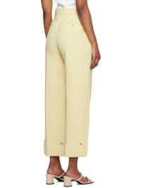 Polyester twill trousers. · Four-pocket styling · Zip fly · Creased legs · Button fastening at rolled cuffs Supplier: Lemon yellow 100% polyester. Made in Japan 231775F087006