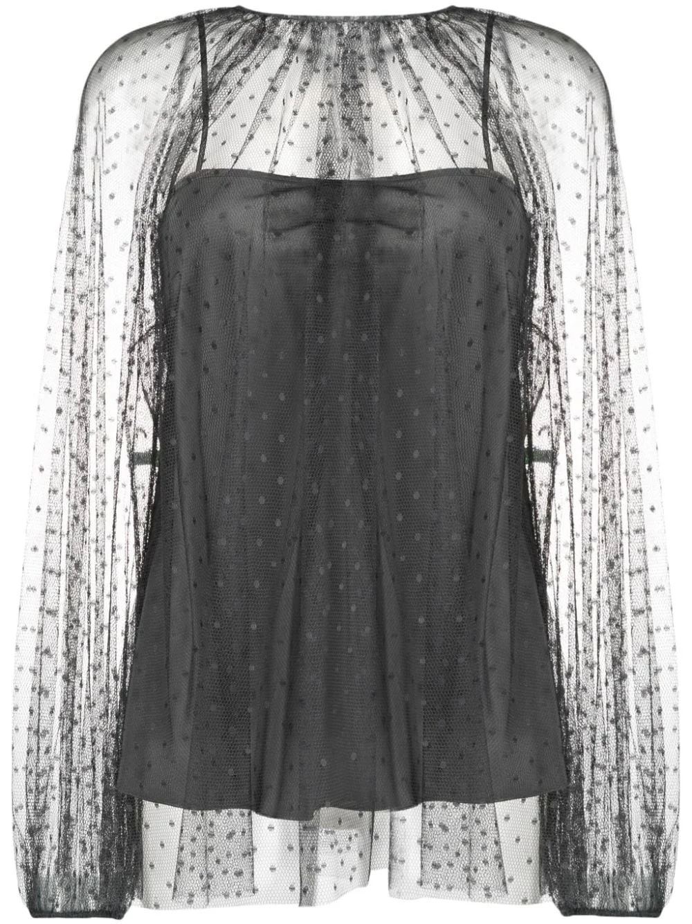 polka-dot tulle blouse Highlights - Light grey - Tulle overlay - Sheer - Polka dot embroidery - Gathered neckline - Balloon sleeves Imported Composition Lining: Polyester 100% Outer: Polyester 100% SIZE & FIT Model measurements Height 5 ft 10 in(1.78 m) Bust/Chest 31.49 in(80 cm) Hips 37 in(94 cm) Waist 23.62 in(60 cm) FittingInformation Designed to be unstructured, offering a loose fit throughout The detachable slip sits just away from the body, offering a close yet comfortable fit Made from a lightweight non-stretch fabric This piece fits true to size – take your usual size Washing instructions Dry Clean Only