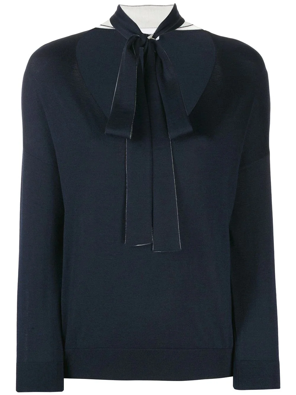 bow tie jumper Blue wool, silk and cashmere blend bow tie jumper from RED Valentino featuring long sleeves and a straight hem. Imported Composition Wool 70%, Silk 20%, Cashmere 10% SIZE & FIT Model measurements Height 5 ft 9 in(1.74 m) Bust/Chest 32.28 in(82 cm) Hips 35.82 in(91 cm) Waist 24.01 in(61 cm) FittingInformation This piece fits true to size. We recommend you get your regular size Cut for a loose fit Made with a lightweight fabric Washing instructions Dry Clean Only