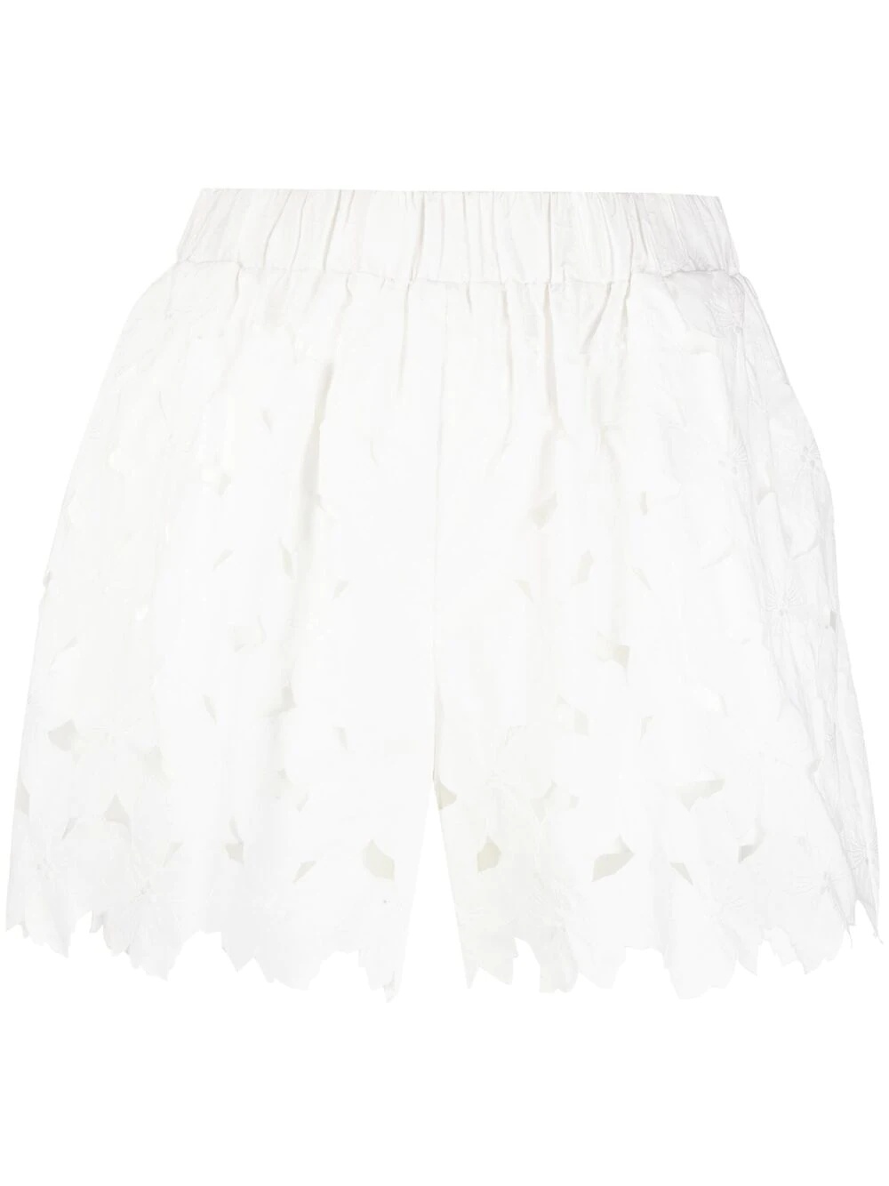 White cotton blend floral-cutout shorts from RED Valentino featuring cut-out floral detailing, layered design, high waist, elasticated waistband and two side slit pockets. Highlights - White - Cotton blend - Cut-out floral detailing - Layered design - High waist - Elasticated waistband - Two side slit pockets Imported Composition outer: Cotton 65%,Polyester 35% lining: Cotton 65%,Polyester 35%
