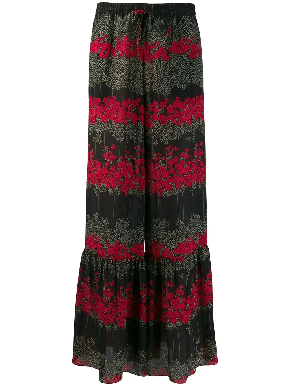 floral flared trousers Black silk blend floral flared trousers from RED Valentino featuring a wide leg, an elasticated drawstring waist, a floral print, a relaxed fit and side slit pockets. Imported Composition Outer: Silk 100% Lining: Acetate 67%, Polyester 33% SIZE & FIT Model measurements Height 5 ft 10 in(1.77 m) Bust/Chest 31.88 in(81 cm) Hips 35.43 in(90 cm) Waist 24.8 in(63 cm) FittingInformation This piece fits true to size. We recommend you get your regular size Designed to be fitted at the waist, loose over the leg Made with a lightweight fabric