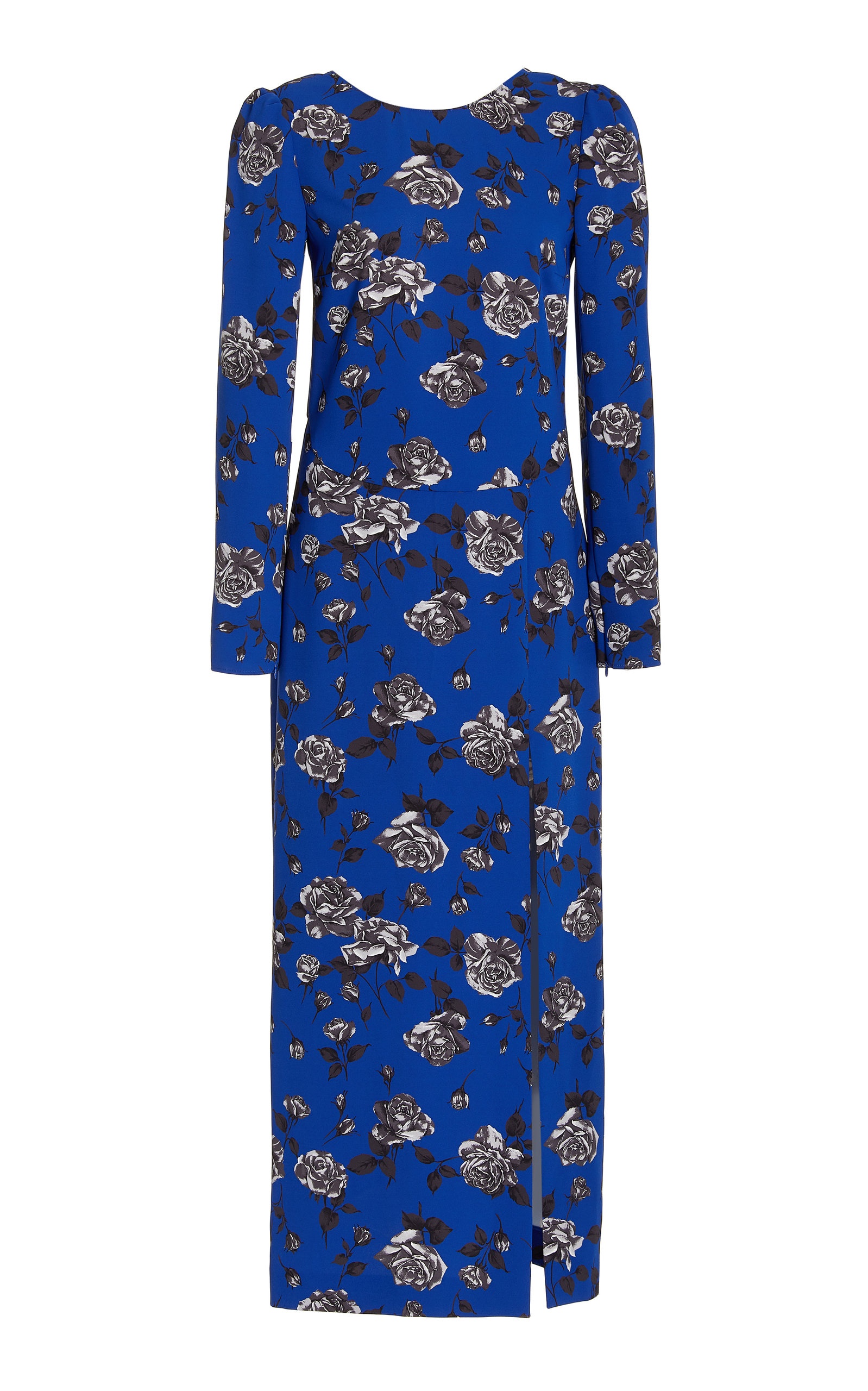 For Fall '21, Red Valentino delivers an all-occasion wardrobe of whimsical, feminine pieces. Alongside edgy point d’esprit tulle—trimmed hoodies, puffers and mini skirts—find ruffles with statement volume, new spins on cozy knitwear, reworked classics, and cool outerwear. This midi dress is crafted from floral-printed georgette, detailed with a round neck, long sleeves, and thigh slit—style yours with chunky loafers to get the brand look. PRODUCT DETAILS - Zip fastening - Designer color: bluette - Composition: 100% polyester - Dry clean - Made in Italy