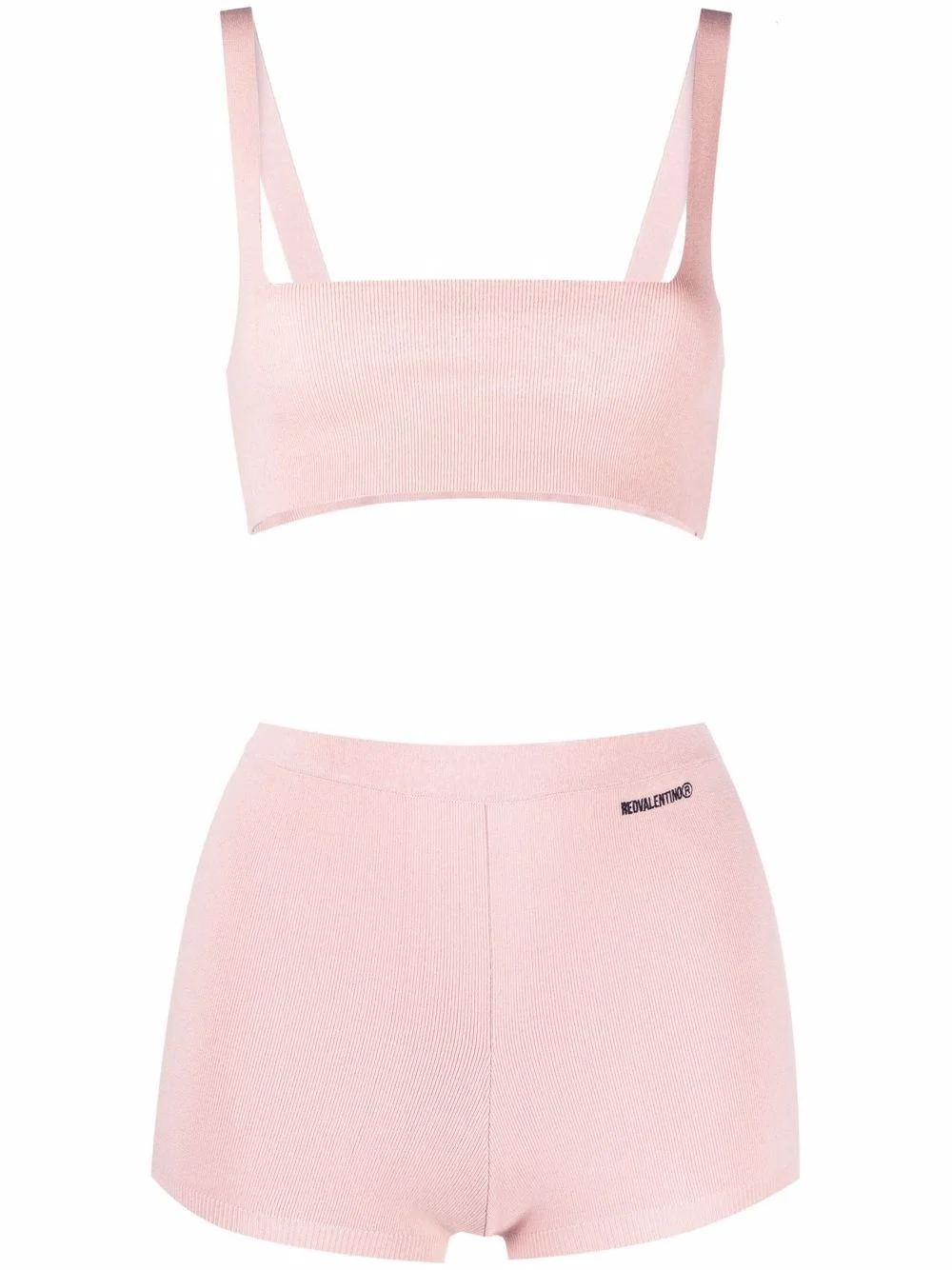 knitted crop top and shorts set In a rib knit construction, this RED Valentino set embraces romance with an urban edge. Detailed with a logo print to the front, this crop top and shorts set incorporate the AW21's free-spirited uniqueness. Imported Composition Viscose 71%, Polyester 29% Washing instructions Machine Wash