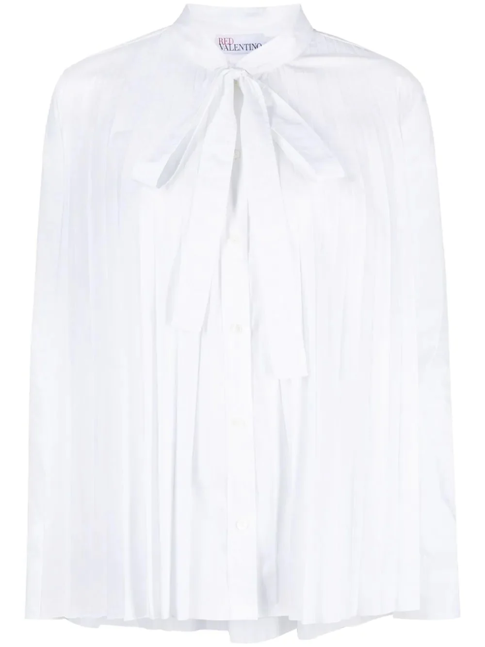 pleated long-sleeved blouse RED Valentino's romantic design style is showcased in the billowing pleated silhouette of this blouse. A pussy-bow collar adds to the piece's delicate feel. Imported Composition Cotton 65%, Polyester 35% SIZE & FIT Model measurements Height 5 ft 11 in(1.8 m) Bust/Chest 31.49 in(80 cm) Hips 35.82 in(91 cm) Waist 24.8 in(63 cm) FittingInformation This piece fits true to size. We recommend you get your regular size Cut for a loose fit Made with a mid-weight non-stretch fabric Washing instructions Dry Clean Only