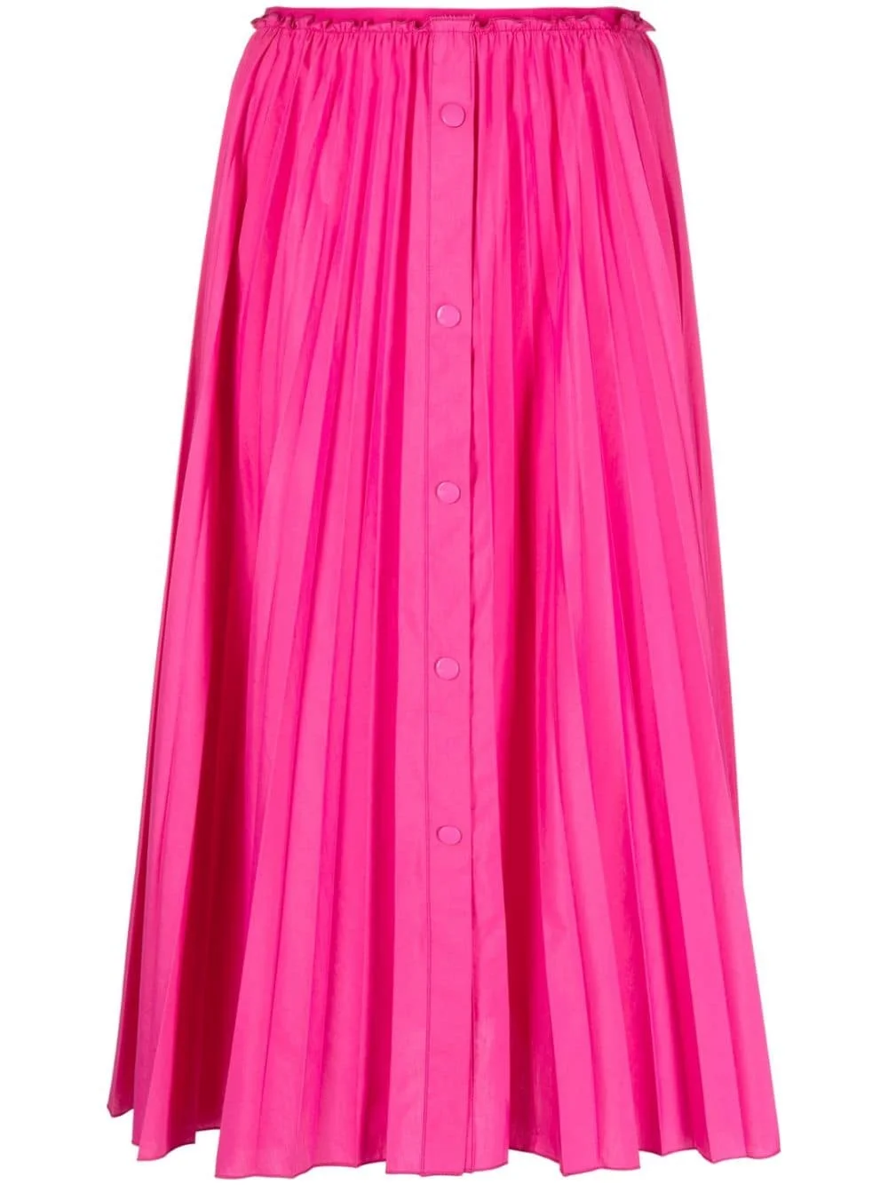 pleated midi skirt This pleated midi skirt by RED Valentino showcases two of the label's signatures: punchy colour and playful detailing. It comes in a bright fuchsia-pink hue with a ruffled waistband and a line of buttons at the front. Highlights - Deep pink - Cotton blend - High-waisted - Elasticated waistband - Fully pleated - Front button fastening - Calf-length Imported Composition Cotton 65%, Polyester 35% Washing instructions Dry Clean Only