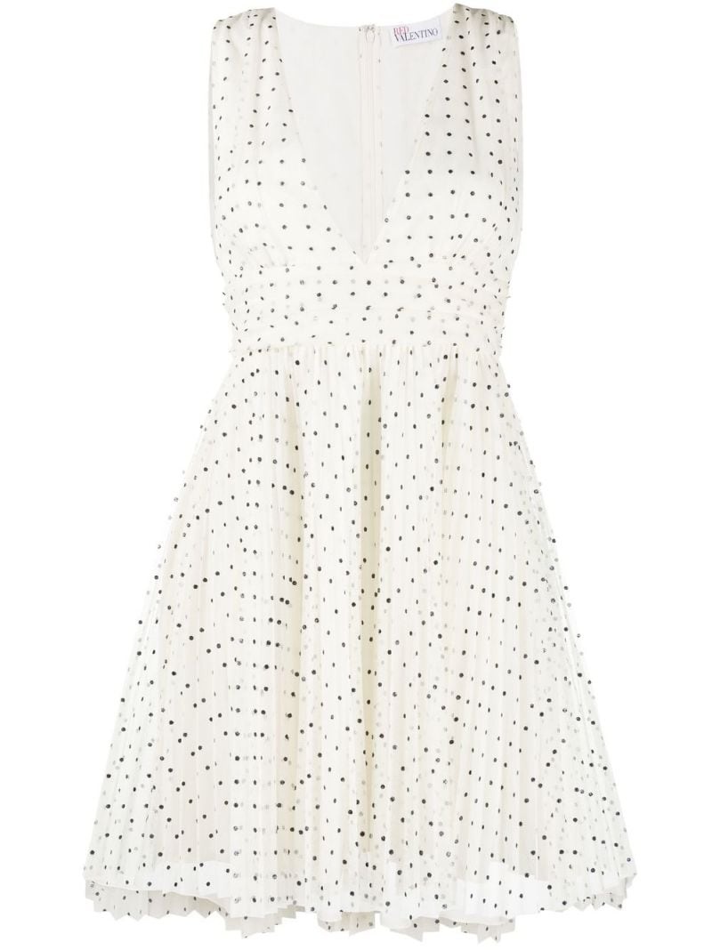 spotted V-neck mini dress from RED Valentino featuring white, black, tulle overlay, spot print, glitter detailing, V-neck, flared skirt, sleeveless, rear zip fastening, straight hem and above-knee length. Imported Composition outer: Polyamide 100% lining: Polyester 100%