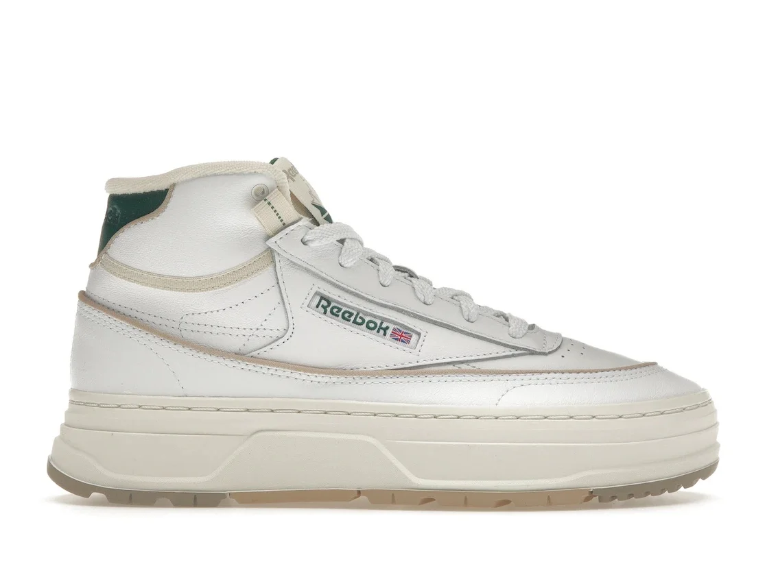 The Reebok Club C Geo Mid White Dark Green W features a mid-cut silhouette and a chunky platform. This Reebok sneaker for women (W) features a geometric design and an elevated combination of materials, like leather and rubber. It has a thick outsole tread, suede mudguard, and a midcut collar. The shoe is made with supple leather and suede alongside a platform midsole in a neutral color palette, that is highlighted by green details. Its lace closure provides a snug fit. It also boasts a linear-patterned sole. The Reebok Club C Geo Mid White Dark Green W was released on the 8th of August, 2022, at a retail price of $160. - Style GZ4936/100048012 - Colorway Cloud White/Chalk/Dark Green - Retail Price 120 - Release Date 2022-08-08 - Featured false