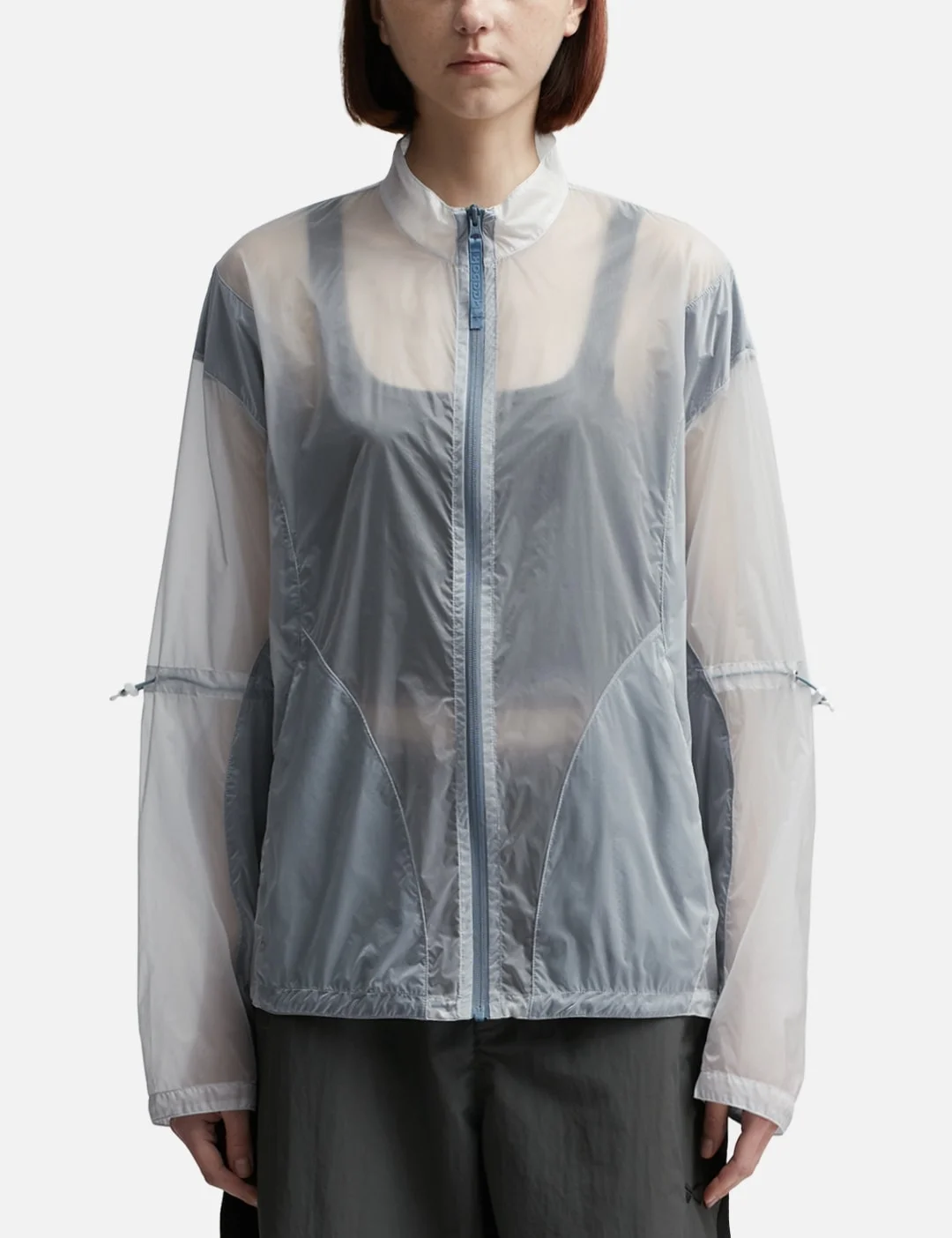 - Reebok - See Through Jacket - Lightweight transparent nylon fabric - Zip closure - Panelled details - Side pockets - Drawcord sleeves and hem - Color: Crystal Blue - Material: 100% Polyamide - See more Jackets and Clothing SIZING Male - Model wears size L - Model measures: Height 188cm, Chest 36”/90cm, Waist 32”/83cm, Hip 37”/93cm - Model wears size S - Model measures: Height 177cm, Chest 32”/81cm, Waist 23.5”/59.7cm, Hip 33’’/83.8cm