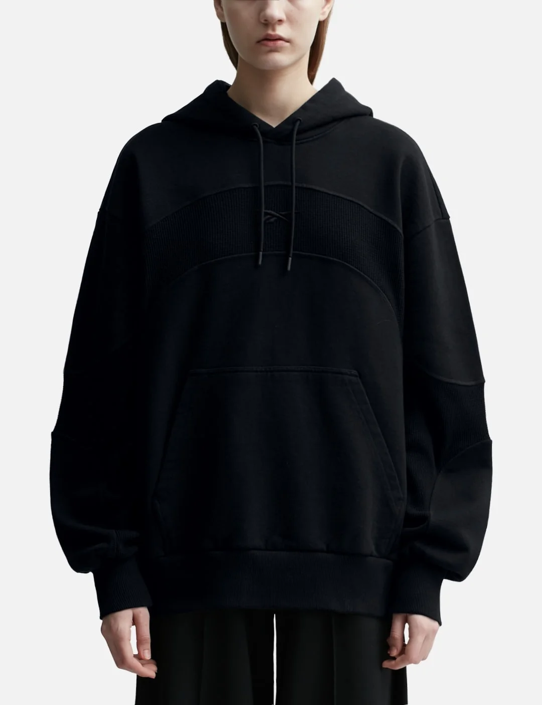 - Reebok - Waffle Pattern Hoodie - Hood with drawstring - Paneled design - Logo embroideries on chest and above back hem - Ribbed cuffs and hem - Kangaroo pocket - Color: Black - Material: 100% Cotton - See more Hoodies and Clothing SIZING Men - Model wears size L - Model measures: Height 187cm, Chest 36”/91cm, Waist 29”/74cm, Hip 37”/94cm - Model wears size S - Model measures: Height 178cm, Chest 33”/84cm, Waist 24’’/61cm, Hip 36’’/91cm