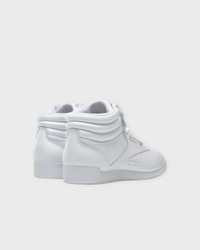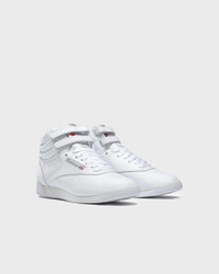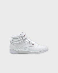 Sneakers Classic Freestyle Hi from Reebok. The iconic high-top sneakers that combine sporty style with comfort. Made from leather and synthetic leather, featuring a textile lining and a flexible sole. The design includes a high, rounded toe, Velcro fastening, and extra heel support. Size and Fit - Fits true to size, choose your usual size Specification - Article number - ID: 176496-010 - Brand: REEBOK - Color: White