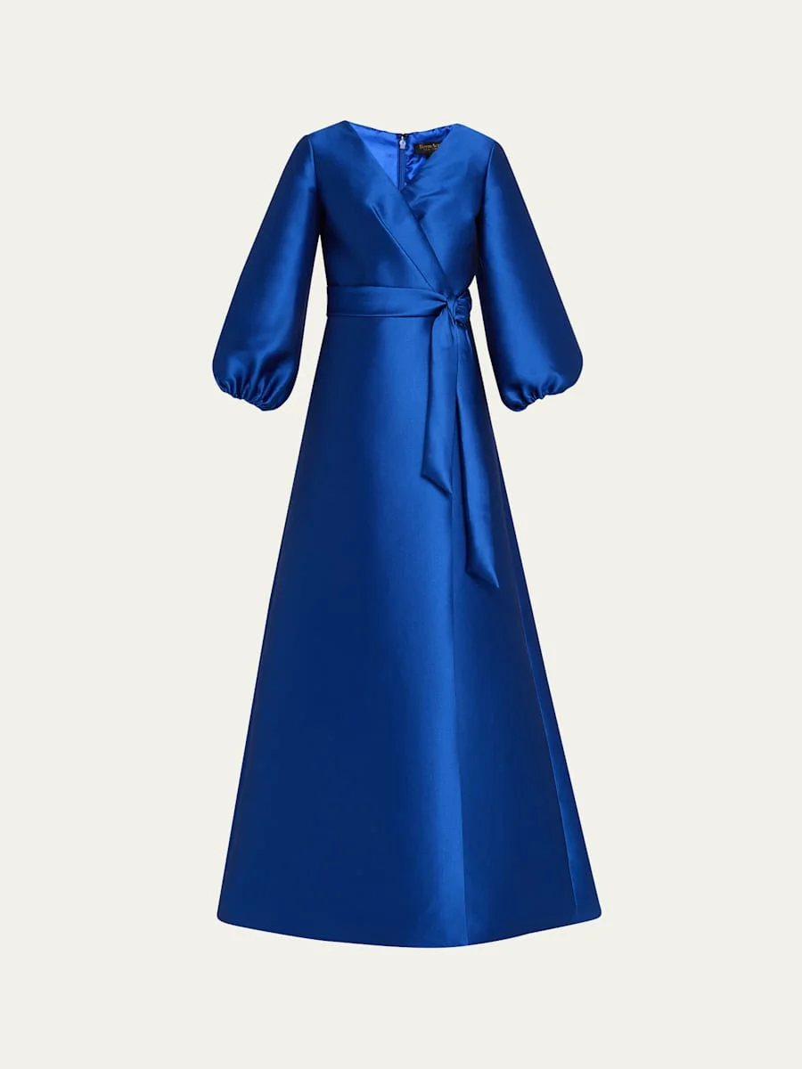 Bishop-Sleeve Mikado Pique Wrap Gown