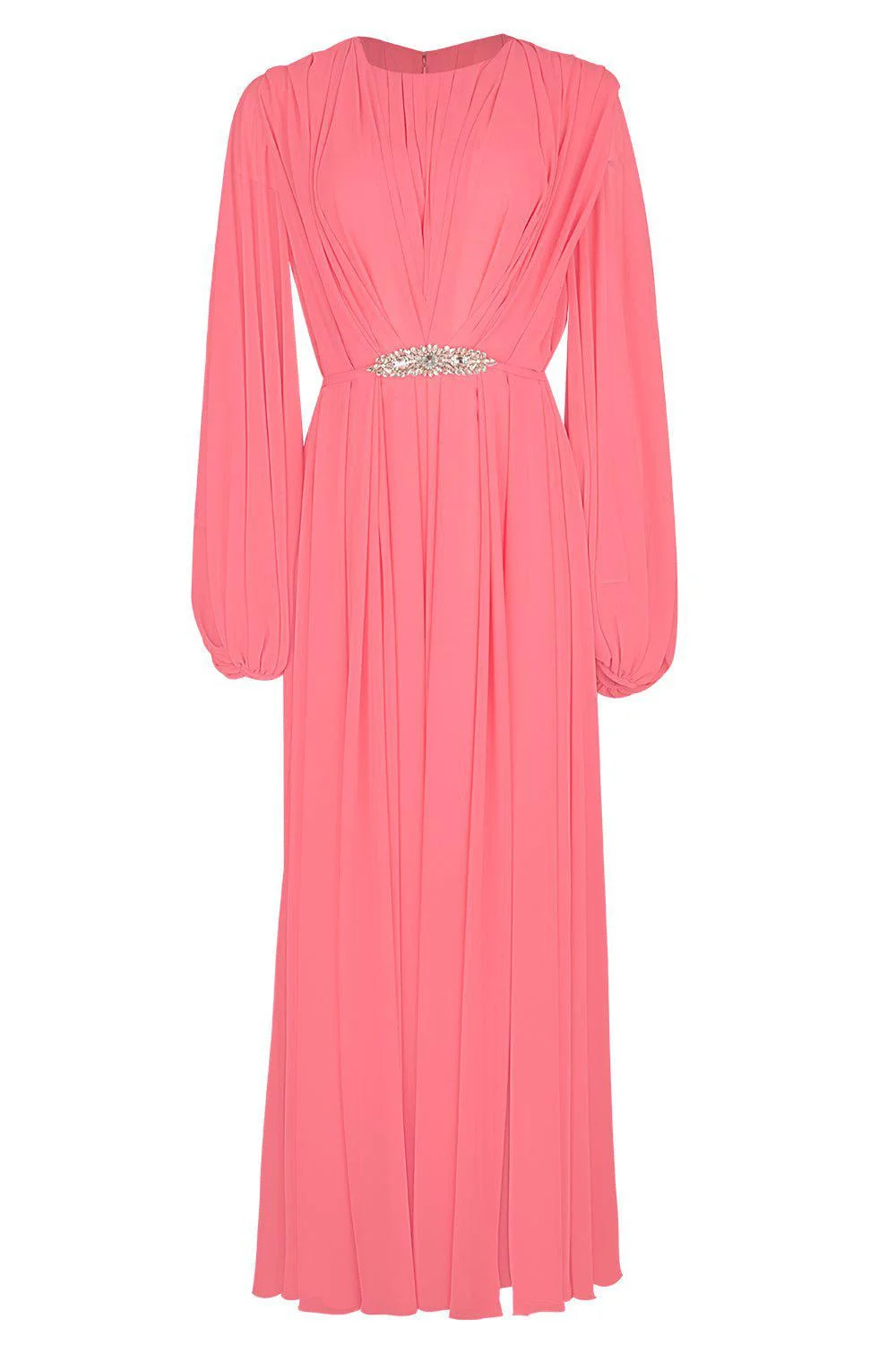 DETAILS AND INSIGHT Reem Acra bubble sleeve gown in strawberry. Chiffon Dry Clean Made in USA Style 586-851-STRAWBERRY