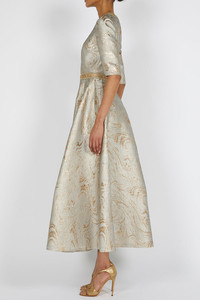 DETAILS AND INSIGHT Reem Acra embellished cocktail dress in platinum marble. Brocade Dry Clean Made in NYC Pre-Order Ships by Jan 7 Style 594-905-PLATNM MARBLE
