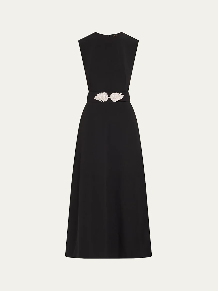 Jewel-Neck Sleeveless Heavy Crepe Midi Dress With An Embellished Belt