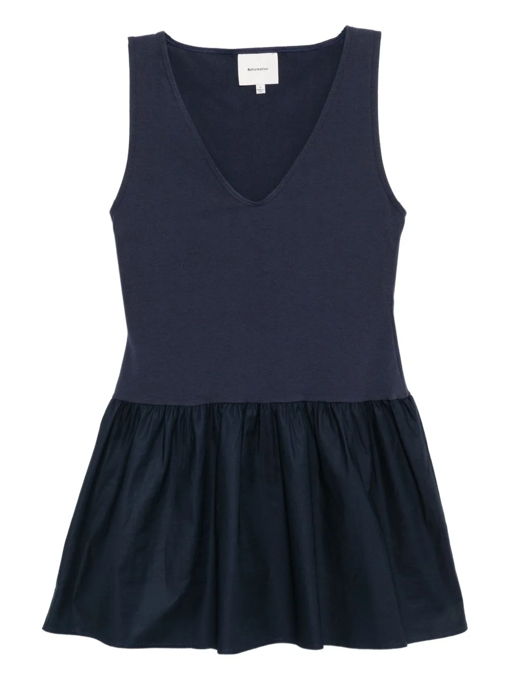 Alyssa dress Highlights - Navy blue - Plunging v-neck - Sleeveless - Gathering at the hip Made in United States Composition Organic Cotton 88%, Spandex/Elastane 12% SIZE & FIT Model measurements Height 5 ft 10 in(1.77 m) Bust/Chest 30.31 in(77 cm) Hips 36.22 in(92 cm) Waist 24.8 in(63 cm) FittingInformation Designed for a close fit at the chest and waist with a loose fit at the hip Made from a midweight non-stretch fabric, this piece offers minimal elasticity when worn