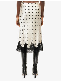 PRODUCT DETAILS - Reformation silk skirt - 100% silk - Relaxed fit, mid-rise, elasticated waistband, floral lace trims at hem, eyelash trims, all-over polka-dot pattern, midi length - Dry clean - True to size - Size small: length 32in / 81cm - Model is 5ft 10in/1.78m and wears a size small - Lightweight, non-stretch Ref: R04546894