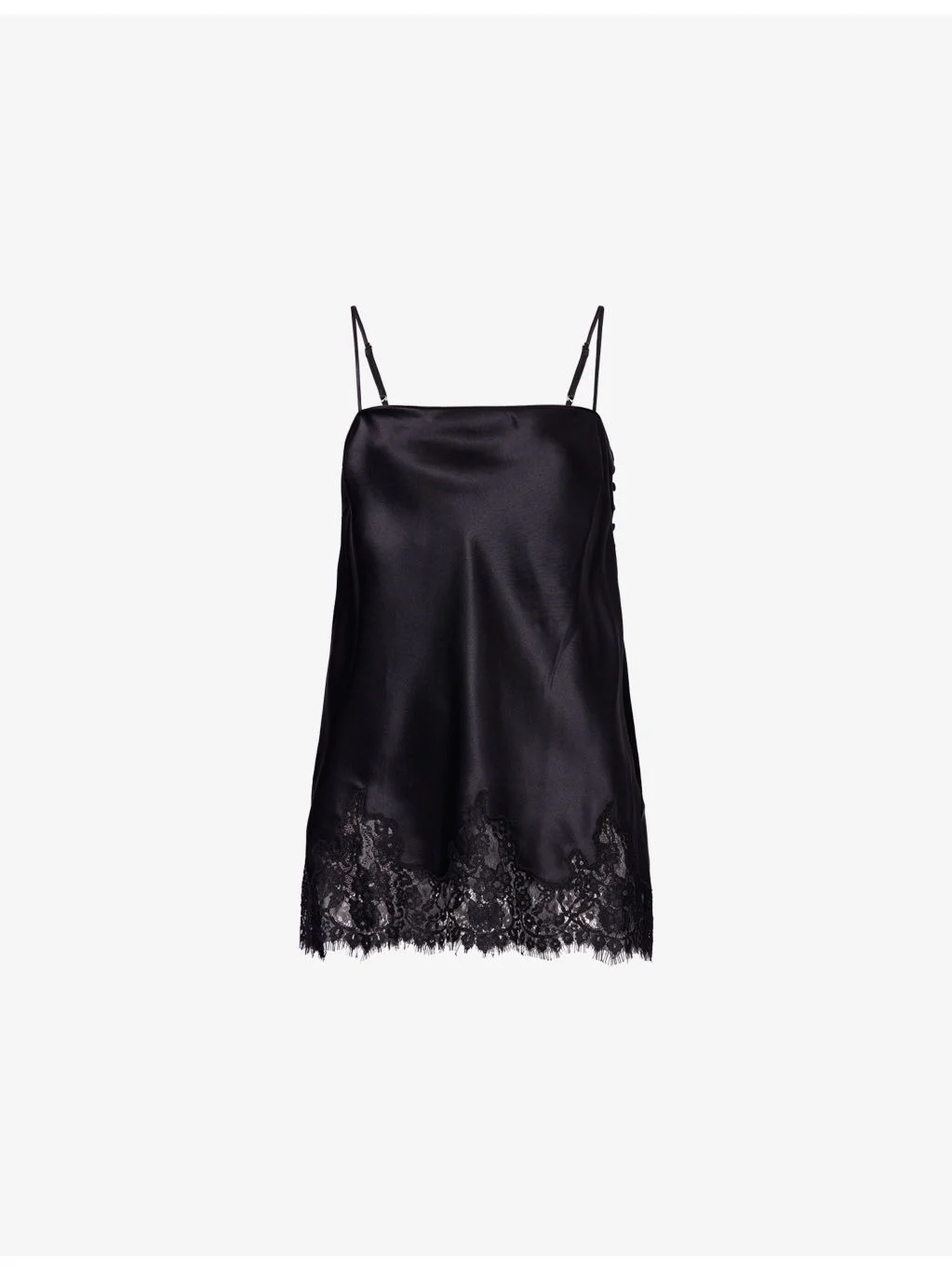 PRODUCT DETAILS - Reformation silk top - 100% silk - Button fastening at side - Regular fit, square neck, adjustable shoulder straps, scalloped lace hem - Dry clean - True to size - Size small: length 26.5in / 67cm - Model is 5ft 10in/1.78m and wears a size small Ref: R04559809