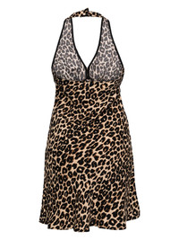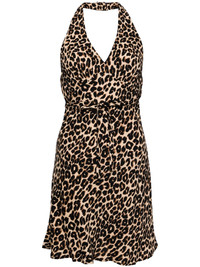 Delanie dress Highlights - Beige/brown/black - Crepe texture - Halterneck button fastening - All-over leopard print - Ruched bodice - Plunging v-neck - Sleeveless - Self-tie fastening - Flared skirt - Thigh-length Imported Composition Viscose 53%, TENCEL™ Lyocell (LENZING) 47%