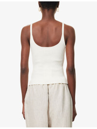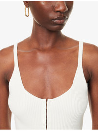 PRODUCT DETAILS - Reformation cotton-blend top - 94% cotton, 5% polyamide, 1% elastane - Concealed hook-and-eye fastenings at front - Slim fit, scoop neck, shoulder straps, all-over ribbed knit - Hand wash cold - True to size - Model is 5ft 10in/1.78m and wears a size small - Lightweight, slight stretch Ref: R04504618
