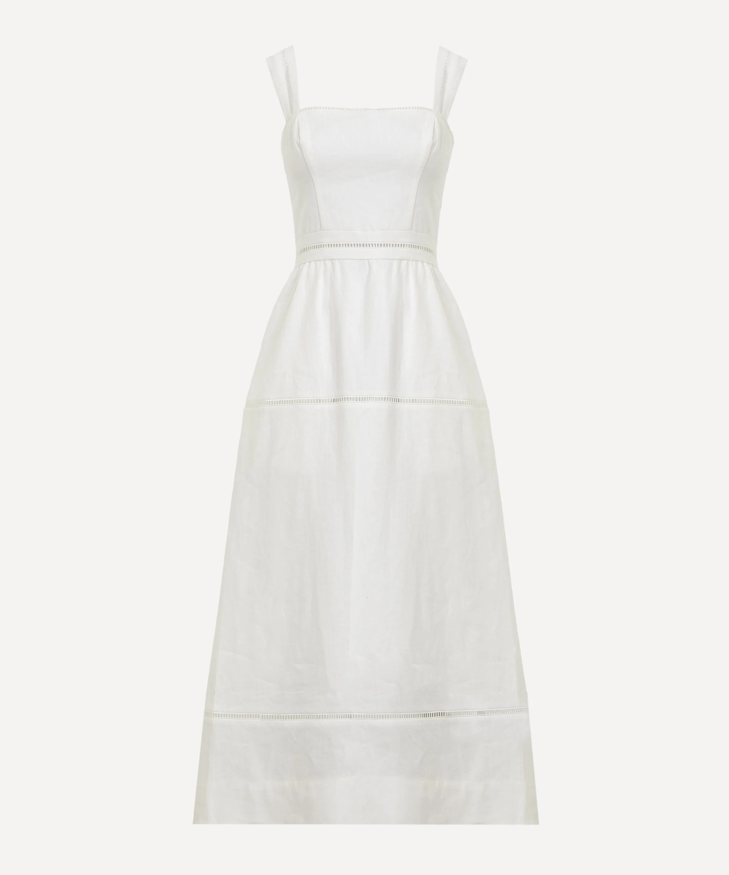 DETAILS Linen midi dress Fitted bodice Square neckline Back smocking Tiered A-line skirt Laddered lace trims SIZE & FIT Model is 180cm/5'11"; Chest: 81cm; Waist: 61cm; Hip: 88cm and wears a size 8 COMPOSITION & CARE 100% Linen Wash cold, dry flat