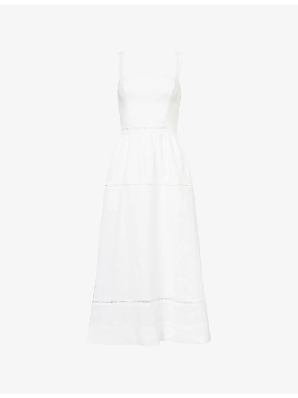 PRODUCT DETAILS - Reformation linen midi dress - 100% linen - Concealed zip fastening at back - Regular fit, square neck, sleeveless, fitted bodice with smocking at back, ladder embroidery, gathered waist, tiered - Machine wash at 30°C - True to size - Size UK 4: length 46.5in / 118cm - Model is 5ft 10in/1.78m and wears a size UK 4 - Midweight, non-stretch Ref: R04477874