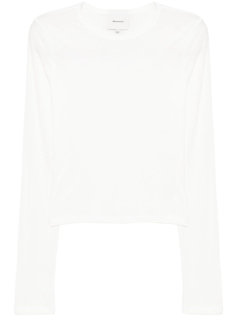 Ezra T-shirt Highlights - White - Organic cotton blend - Knitted construction - Long sleeves - Crew neck - Straight hem Made in United States Composition Organic Cotton 70%, TENCEL™ Lyocell (LENZING) 30% SIZE & FIT Model measurements Height 5 ft 10 in(1.77 m) Bust/Chest 31.49 in(80 cm) Hips 35.43 in(90 cm) Waist 25.19 in(64 cm) FittingInformation Designed for a slim fit that sits just away from the body offering a close yet comfortable fit Made from a lightweight non-stretch fabric, this piece offers minimal elasticity when worn Washing instructions Machine Wash