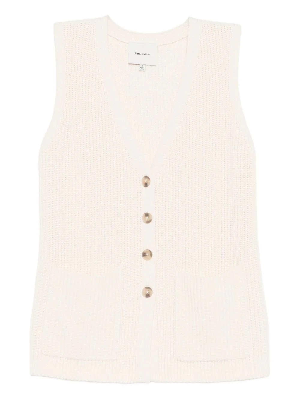 Faye sweater Highlights - Ivory white - Front button fastening - Sleeveless - Two front patch pockets Imported Composition Cotton 100% Washing instructions Machine Wash