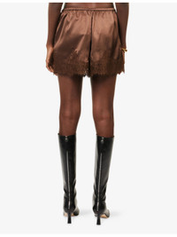 PRODUCT DETAILS - Reformation satin shorts - 88% acetate, 12% polyester - Relaxed fit, high-rise, elasticated waistband, lace trims at hem, eyelash trims, satin finish - Dry clean - True to size - Model is 5ft 10in/1.78m and wears a size small - Lightweight, non-stretch Ref: R04546893