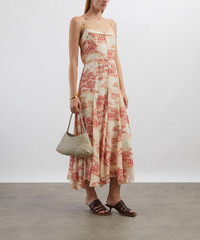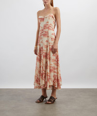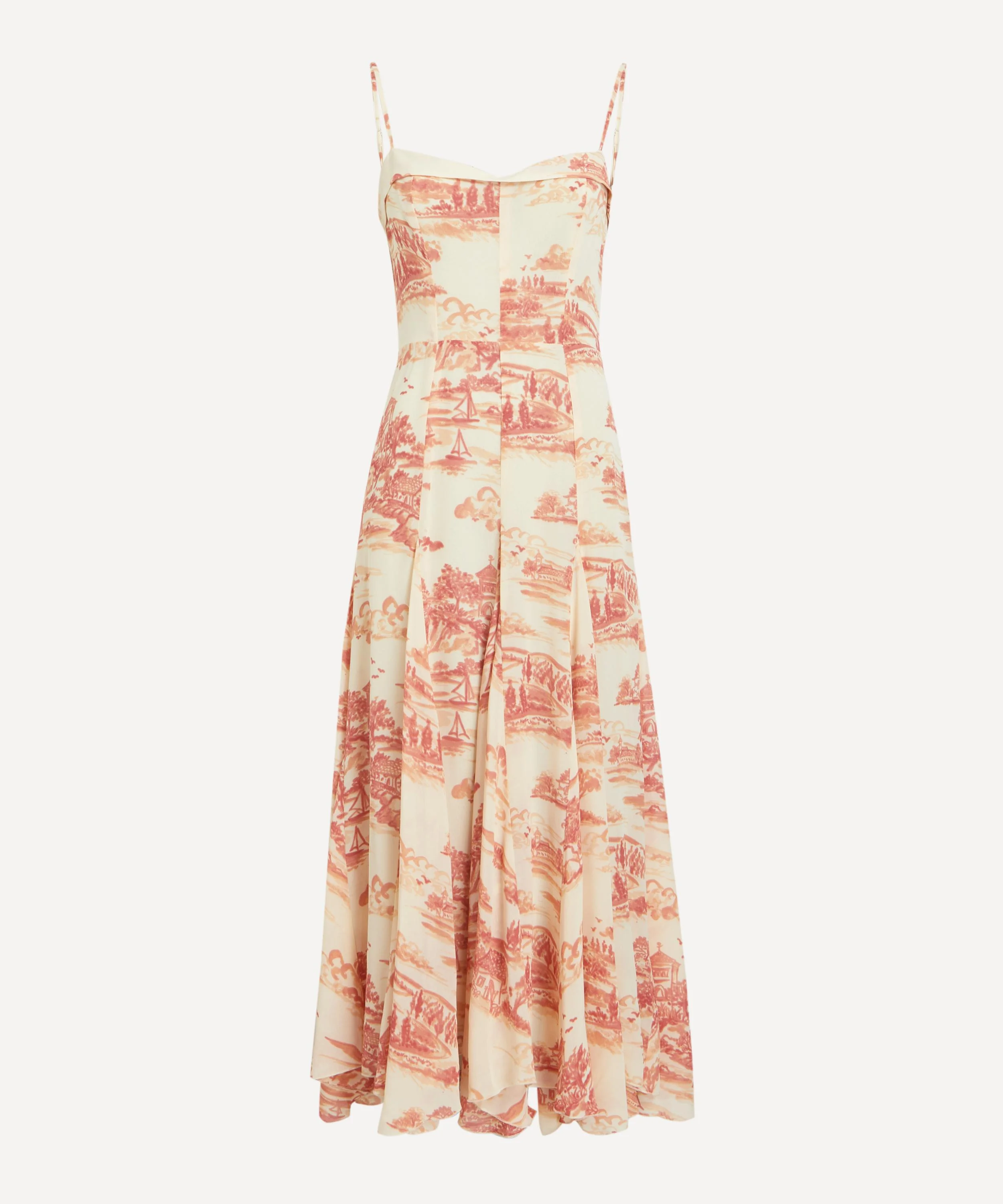 DETAILS Georgette dress Toile de jouy print Midi length Fitted bodice Spaghetti straps Draped sweetheart neckline Open back A-line skirt SIZE & FIT Model is 175cm/5'9"; Chest: 76cm; Waist: 58cm; Hip: 90cm and wears a size S COMPOSITION & CARE 100% Viscose Dry clean
