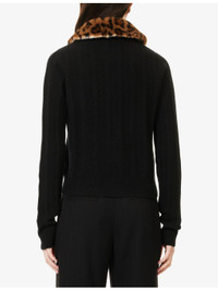 PRODUCT DETAILS - Reformation merino-wool cardigan - 100% wool; contrast 100% polyester; lining 95% polyester, 5% elastane - Exposed button fastenings at front - Regular fit, crewneck, detachable leopard-pattern faux-fur collar, long sleeves, ribbed trims, all-over ribbed and knitted - Dry clean - True to size - Model is 5ft 10in/1.78m and wears a size UK 8 - Lightweight, slight stretch Ref: R04559806
