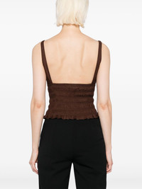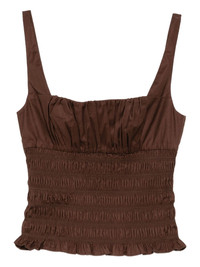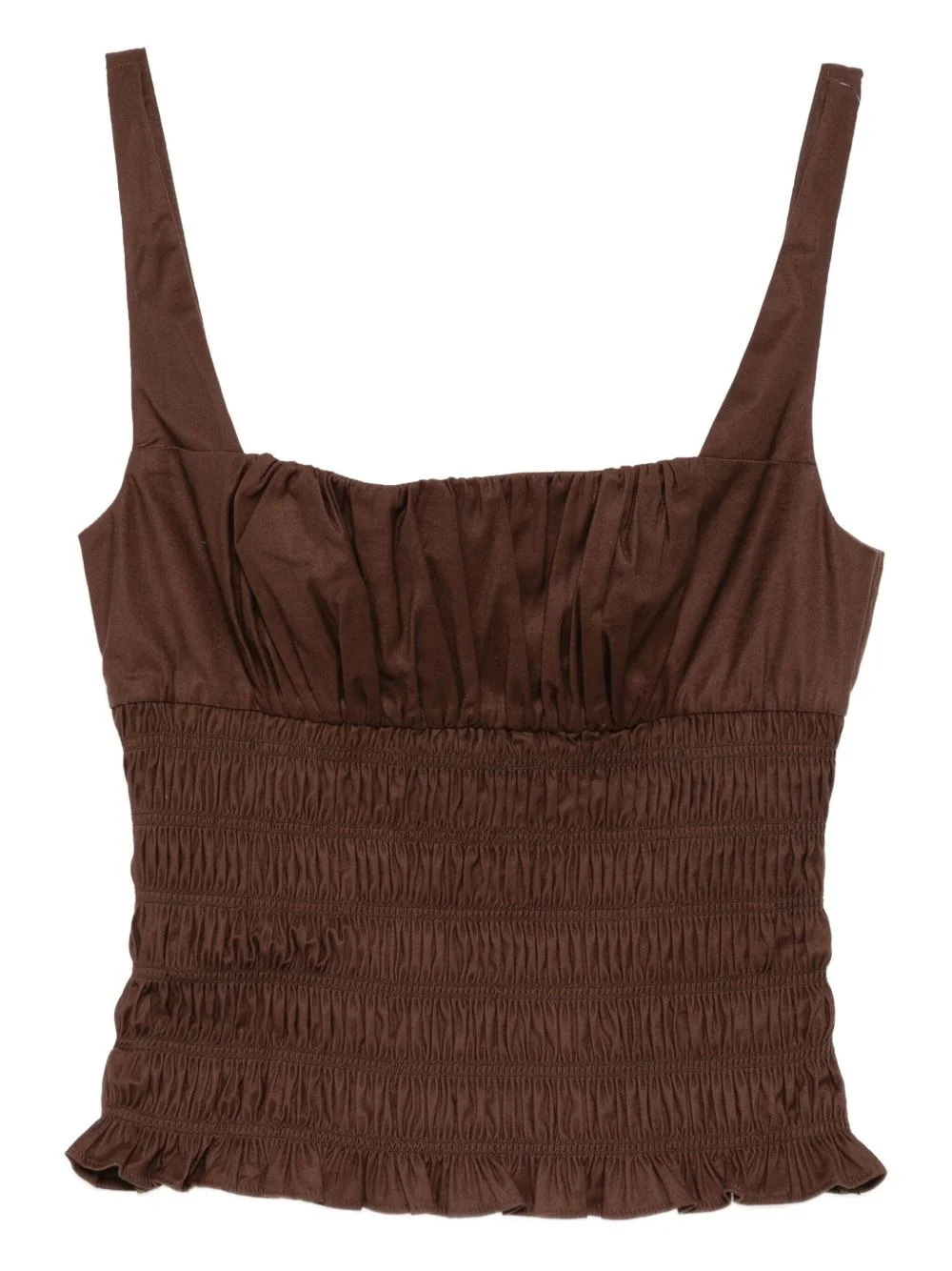 Jeanette top Highlights - Dark brown - Smocking details - Square neck - Low back Imported Composition Organic Cotton 98%, Elastane 2% SIZE & FIT Model measurements Height 5 ft 10 in(1.78 m) Bust/Chest 31.88 in(81 cm) Hips 37 in(94 cm) Waist 25.19 in(64 cm) FittingInformation Designed for a close fit throughout The elasticated waist allows for a comfortable fit Made from a midweight stretch fabric, this piece offers elasticity and flexibility when worn Washing instructions Machine Wash