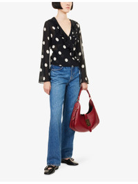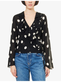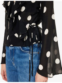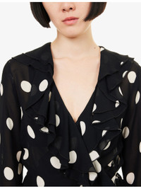 PRODUCT DETAILS - Reformation crepe top - 100% viscose - Concealed hook-and-eye and self-tie fastenings at front - Regular fit, V-neck, ruffled collar, long sleeves, wrap design, all-over polka dot pattern - Dry clean - Made in Mexico - True to size - Size UK 8: length 22in / 56cm - Model is 5ft 10in/1.78m and wears a size UK 8 - Lightweight, non-stretch Ref: R04522332